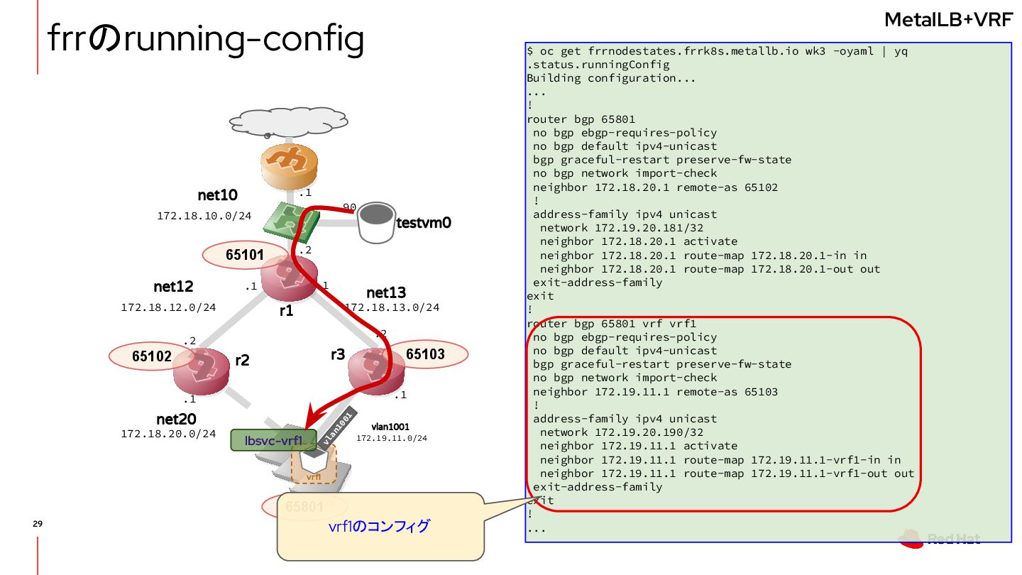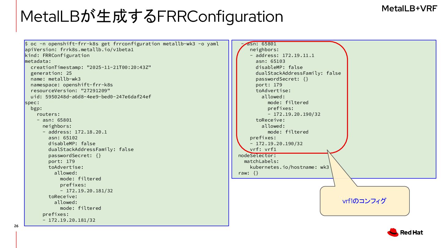 false dualStackAddressFamily: false passwordSecret: {} port: 179 toAdvertise: allowed: mode: filtered prefixes: - 172.19.20.190/32 toReceive: allowed: mode: filtered prefixes: - 172.19.20.190/32 vrf: vrf1 nodeSelector: matchLabels: kubernetes.io/hostname: wk3 raw: {} MetalLBが生成するFRRConfiguration 26 $ oc -n openshift-frr-k8s get frrconfiguration metallb-wk3 -o yaml apiVersion: frrk8s.metallb.io/v1beta1 kind: FRRConfiguration metadata: creationTimestamp: "2025-11-21T00:20:43Z" generation: 25 name: metallb-wk3 namespace: openshift-frr-k8s resourceVersion: "27291209" uid: 5950248d-a6d8-4ee9-bed0-247e6daf24ef spec: bgp: routers: - asn: 65801 neighbors: - address: 172.18.20.1 asn: 65102 disableMP: false dualStackAddressFamily: false passwordSecret: {} port: 179 toAdvertise: allowed: mode: filtered prefixes: - 172.19.20.181/32 toReceive: allowed: mode: filtered prefixes: - 172.19.20.181/32 vrf1のコンフィグ MetalLB+VRF