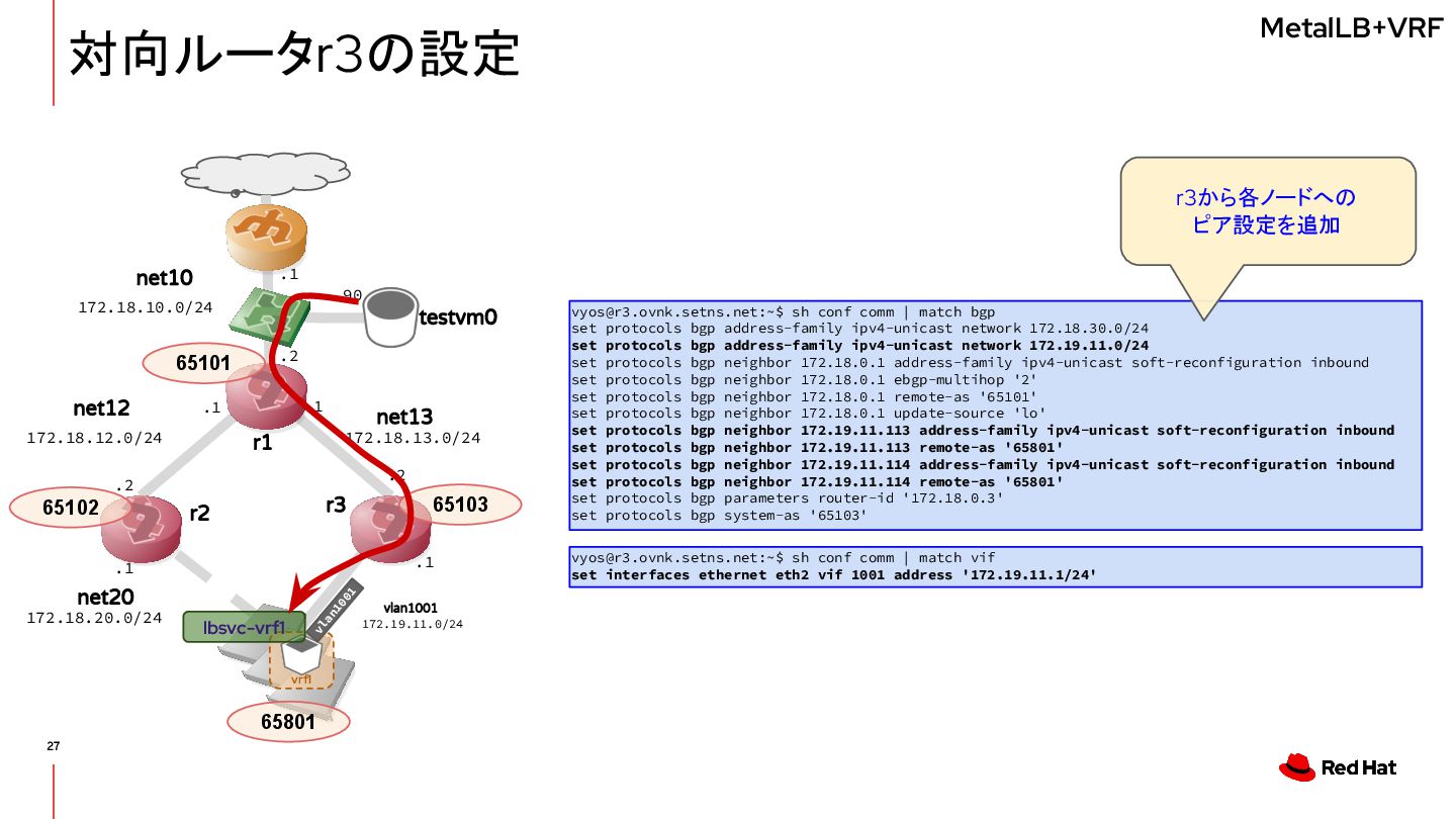 172.18.13.0/24 172.18.20.0/24 .1 .2 .2 .1 .2 .1 .90 65101 65102 65103 .1 .1 testvm0 vrf1 vlan1001 vlan1001 172.19.11.0/24 65801 27 lbsvc-vrf1 [email protected]:~$ sh conf comm | match bgp set protocols bgp address-family ipv4-unicast network 172.18.30.0/24 set protocols bgp address-family ipv4-unicast network 172.19.11.0/24 set protocols bgp neighbor 172.18.0.1 address-family ipv4-unicast soft-reconfiguration inbound set protocols bgp neighbor 172.18.0.1 ebgp-multihop '2' set protocols bgp neighbor 172.18.0.1 remote-as '65101' set protocols bgp neighbor 172.18.0.1 update-source 'lo' set protocols bgp neighbor 172.19.11.113 address-family ipv4-unicast soft-reconfiguration inbound set protocols bgp neighbor 172.19.11.113 remote-as '65801' set protocols bgp neighbor 172.19.11.114 address-family ipv4-unicast soft-reconfiguration inbound set protocols bgp neighbor 172.19.11.114 remote-as '65801' set protocols bgp parameters router-id '172.18.0.3' set protocols bgp system-as '65103' r3から各ノードへの ピア設定を追加 [email protected]:~$ sh conf comm | match vif set interfaces ethernet eth2 vif 1001 address '172.19.11.1/24' MetalLB+VRF