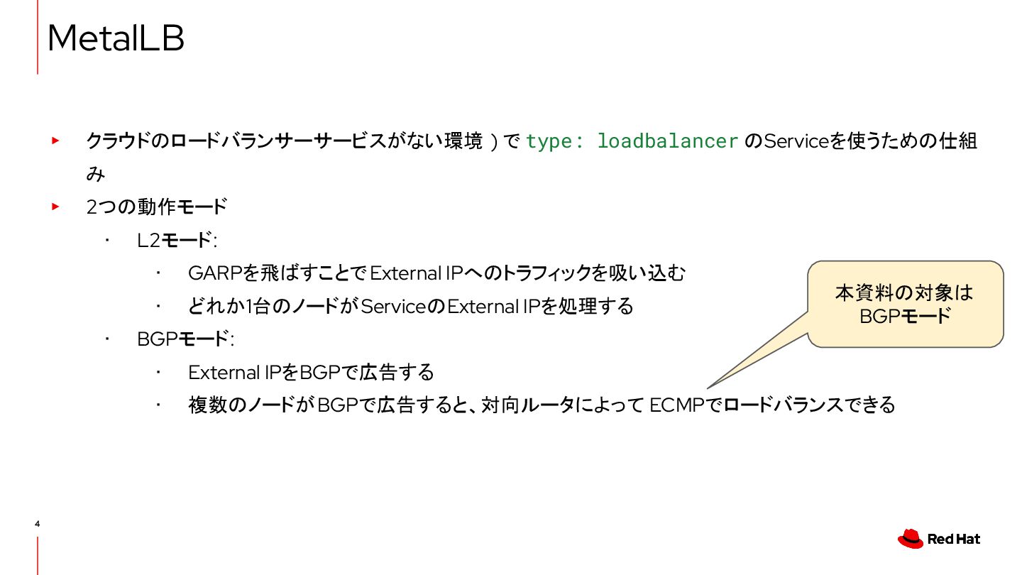 EgressService以外は、OpenShiftでないのKubernetes環境でも同じように動くと思います ▸ upstreamのドキュメントにはFRR-k8sが “Experimental” と表現されていますが、 v4.17以降のOpenShiftに MetalLB Operatorを入れるとデフォルトで FRR-k8s backend設定になります 3 https://metallb.io/concepts/bgp/#frr-k8s-mode