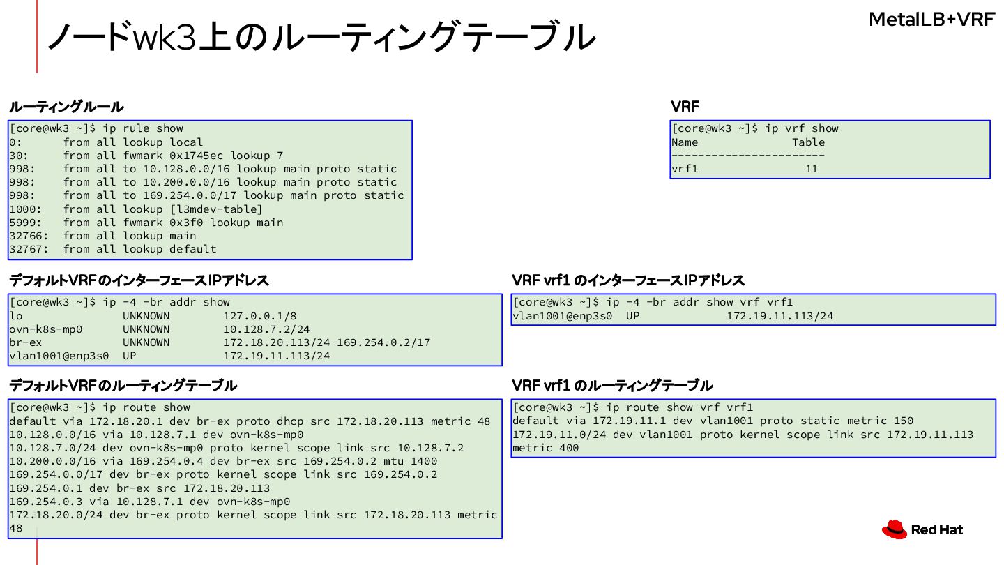 UNKNOWN 127.0.0.1/8 ovn-k8s-mp0 UNKNOWN 10.128.7.2/24 br-ex UNKNOWN 172.18.20.113/24 169.254.0.2/17 vlan1001@enp3s0 UP 172.19.11.113/24 [core@wk3 ~]$ ip -4 -br addr show vrf vrf1 vlan1001@enp3s0 UP 172.19.11.113/24 [core@wk3 ~]$ ip route show vrf vrf1 default via 172.19.11.1 dev vlan1001 proto static metric 150 172.19.11.0/24 dev vlan1001 proto kernel scope link src 172.19.11.113 metric 400 デフォルトVRFのインターフェースIPアドレス VRF vrf1 のインターフェースIPアドレス デフォルトVRFのルーティングテーブル VRF vrf1 のルーティングテーブル [core@wk3 ~]$ ip rule show 0: from all lookup local 30: from all fwmark 0x1745ec lookup 7 998: from all to 10.128.0.0/16 lookup main proto static 998: from all to 10.200.0.0/16 lookup main proto static 998: from all to 169.254.0.0/17 lookup main proto static 1000: from all lookup [l3mdev-table] 5999: from all fwmark 0x3f0 lookup main 32766: from all lookup main 32767: from all lookup default [core@wk3 ~]$ ip vrf show Name Table ----------------------- vrf1 11 ルーティングルール VRF [core@wk3 ~]$ ip route show default via 172.18.20.1 dev br-ex proto dhcp src 172.18.20.113 metric 48 10.128.0.0/16 via 10.128.7.1 dev ovn-k8s-mp0 10.128.7.0/24 dev ovn-k8s-mp0 proto kernel scope link src 10.128.7.2 10.200.0.0/16 via 169.254.0.4 dev br-ex src 169.254.0.2 mtu 1400 169.254.0.0/17 dev br-ex proto kernel scope link src 169.254.0.2 169.254.0.1 dev br-ex src 172.18.20.113 169.254.0.3 via 10.128.7.1 dev ovn-k8s-mp0 172.18.20.0/24 dev br-ex proto kernel scope link src 172.18.20.113 metric 48 MetalLB+VRF