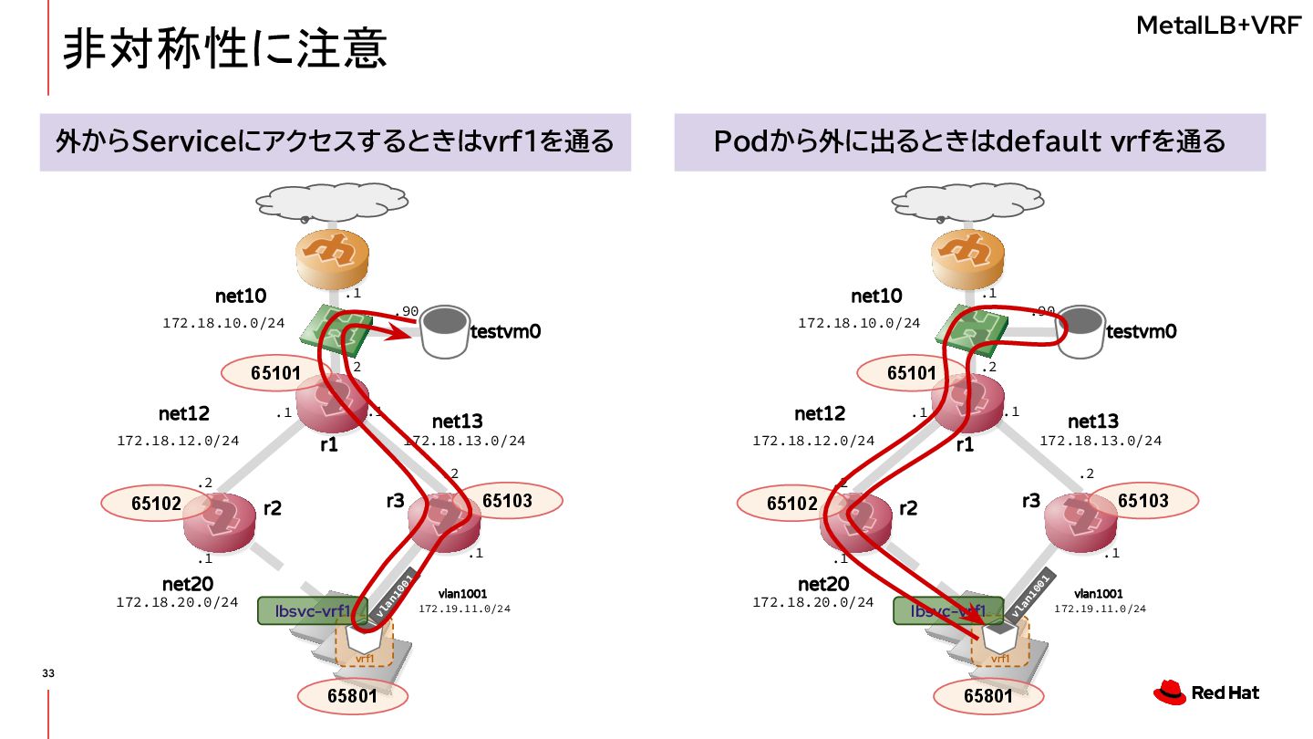 172.18.12.0/24 172.18.13.0/24 172.18.20.0/24 .1 .2 .2 .1 .2 .1 .90 65101 65102 65103 .1 .1 testvm0 vrf1 vlan1001 vlan1001 172.19.11.0/24 65801 lbsvc-vrf1 r1 net10 net12 net13 r2 r3 net20 172.18.10.0/24 172.18.12.0/24 172.18.13.0/24 172.18.20.0/24 .1 .2 .2 .1 .2 .1 .90 65101 65102 65103 .1 .1 testvm0 vrf1 vlan1001 vlan1001 172.19.11.0/24 65801 lbsvc-vrf1 外からServiceにアクセスするときはvrf1を通る Podから外に出るときはdefault vrfを通る MetalLB+VRF