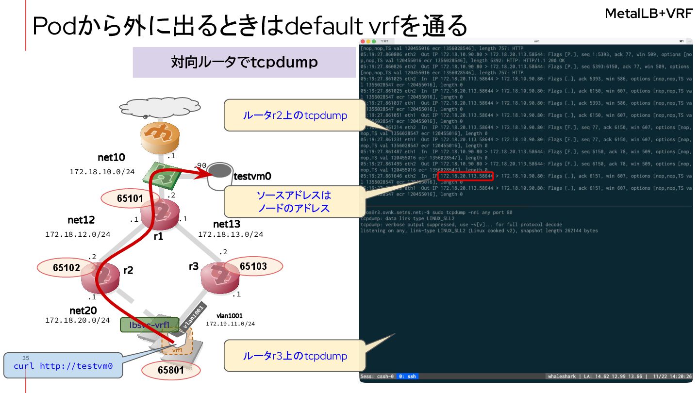 net20 172.18.10.0/24 172.18.12.0/24 172.18.13.0/24 172.18.20.0/24 .1 .2 .2 .1 .2 .1 .90 65101 65102 65103 .1 .1 testvm0 vrf1 vlan1001 vlan1001 172.19.11.0/24 65801 lbsvc-vrf1 対向ルータでtcpdump curl http://testvm0 ルータr2上のtcpdump ルータr3上のtcpdump ソースアドレスは ノードのアドレス