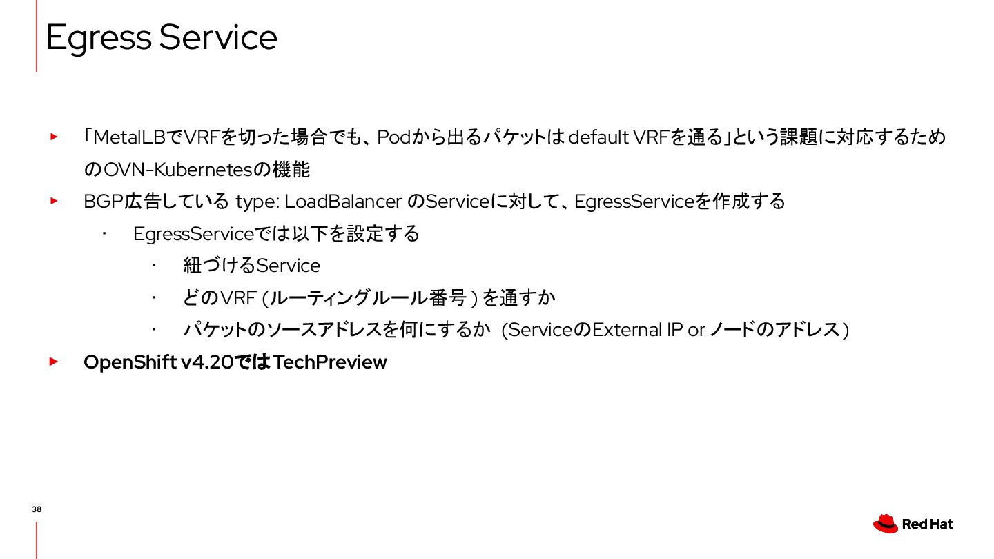 のServiceに対して、EgressServiceを作成する ・ EgressServiceでは以下を設定する ・ 紐づけるService ・ どのVRF (ルーティングルール番号 ) を通すか ・ パケットのソースアドレスを何にするか (ServiceのExternal IP or ノードのアドレス) ▸ OpenShift v4.20ではTechPreview 38