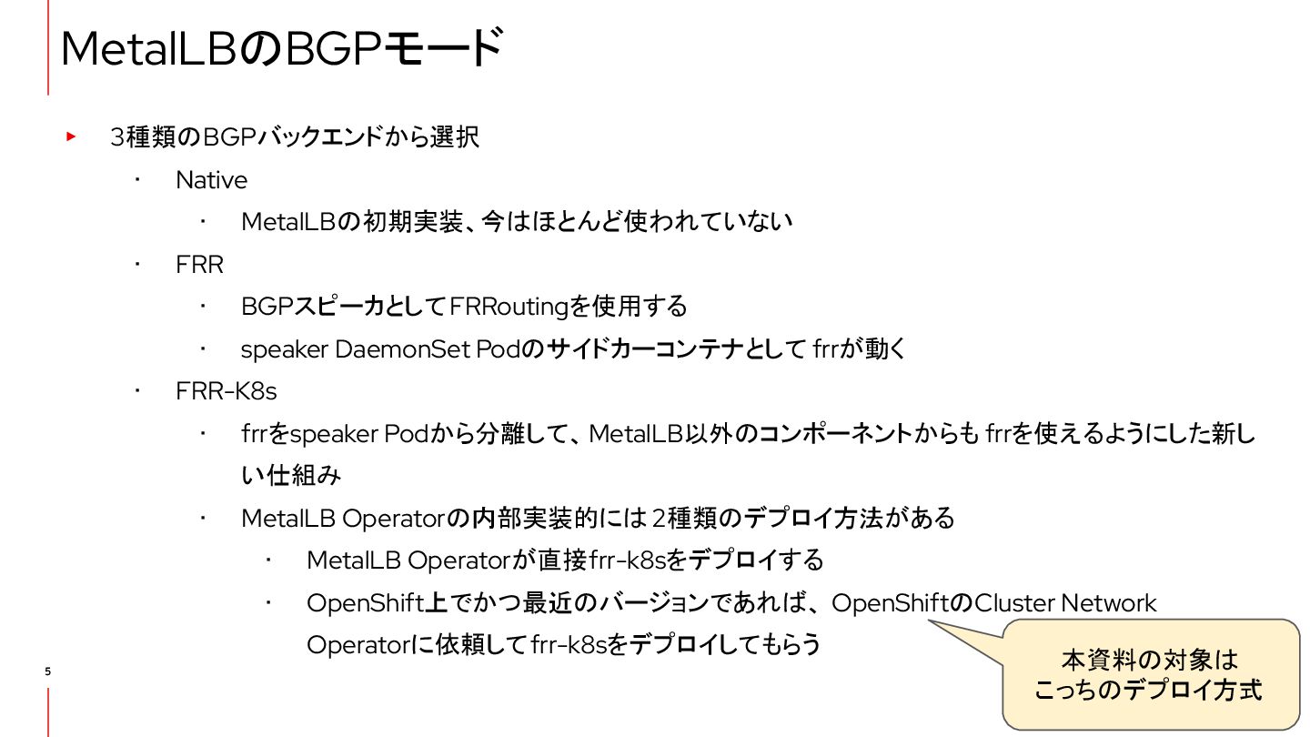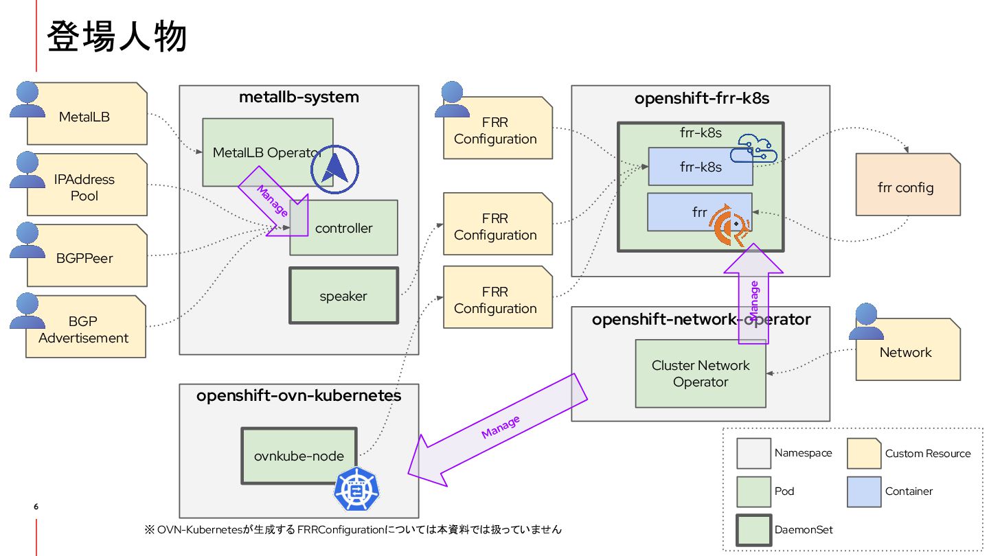 BGPスピーカとしてFRRoutingを使用する ・ speaker DaemonSet Podのサイドカーコンテナとして frrが動く ・ FRR-K8s ・ frrをspeaker Podから分離して、MetalLB以外のコンポーネントからも frrを使えるようにした新し い仕組み ・ MetalLB Operatorの内部実装的には2種類のデプロイ方法がある ・ MetalLB Operatorが直接frr-k8sをデプロイする ・ OpenShift上でかつ最近のバージョンであれば、 OpenShiftのCluster Network Operatorに依頼してfrr-k8sをデプロイしてもらう 5 本資料の対象は こっちのデプロイ方式