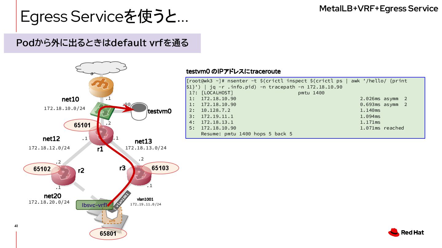 172.18.10.0/24 172.18.12.0/24 172.18.13.0/24 172.18.20.0/24 .1 .2 .2 .1 .2 .1 .90 65101 65102 65103 .1 .1 testvm0 vrf1 vlan1001 vlan1001 172.19.11.0/24 65801 lbsvc-vrf1 Podから外に出るときはdefault vrfを通る [root@wk3 ~]# nsenter -t $(crictl inspect $(crictl ps | awk '/hello/ {print $1}') | jq -r .info.pid) -n tracepath -n 172.18.10.90 1?: [LOCALHOST] pmtu 1400 1: 172.18.10.90 2.026ms asymm 2 1: 172.18.10.90 0.693ms asymm 2 2: 10.128.7.2 1.140ms 3: 172.19.11.1 1.094ms 4: 172.18.13.1 1.171ms 5: 172.18.10.90 1.071ms reached Resume: pmtu 1400 hops 5 back 5 testvm0 のIPアドレスにtraceroute MetalLB+VRF+Egress Service