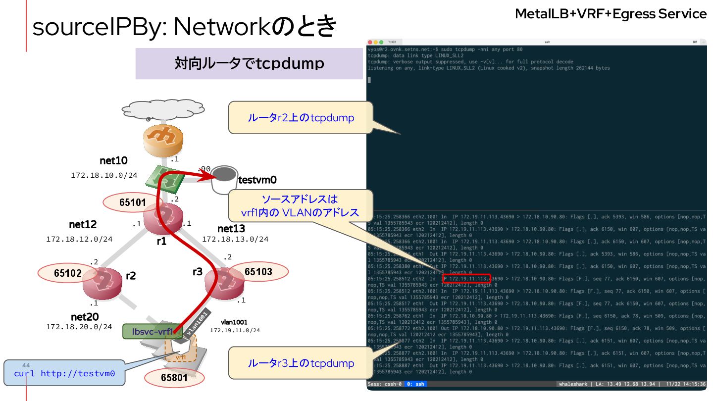 172.18.10.0/24 172.18.12.0/24 172.18.13.0/24 172.18.20.0/24 .1 .2 .2 .1 .2 .1 .90 65101 65102 65103 .1 .1 testvm0 vrf1 vlan1001 vlan1001 172.19.11.0/24 65801 lbsvc-vrf1 対向ルータでtcpdump curl http://testvm0 ルータr2上のtcpdump ルータr3上のtcpdump ソースアドレスは Serviceのアドレス MetalLB+VRF+Egress Service