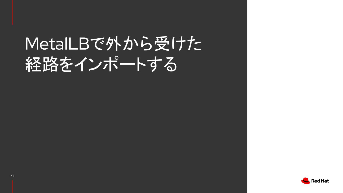 172.18.13.0/24 172.18.20.0/24 .1 .2 .2 .1 .2 .1 .90 65101 65102 65103 .1 .1 testvm0 net30 172.18.30.0/24 apiVersion: frrk8s.metallb.io/v1beta1 kind: FRRConfiguration metadata: name: receive-all namespace: openshift-frr-k8s spec: bgp: routers: - asn: 65801 neighbors: - address: 172.18.20.1 asn: 65102 toReceive: allowed: mode: all FRRConfiguration 65801 47 hello-lb-l3 MetalLB route import 受けた経路を全て インポートする設定