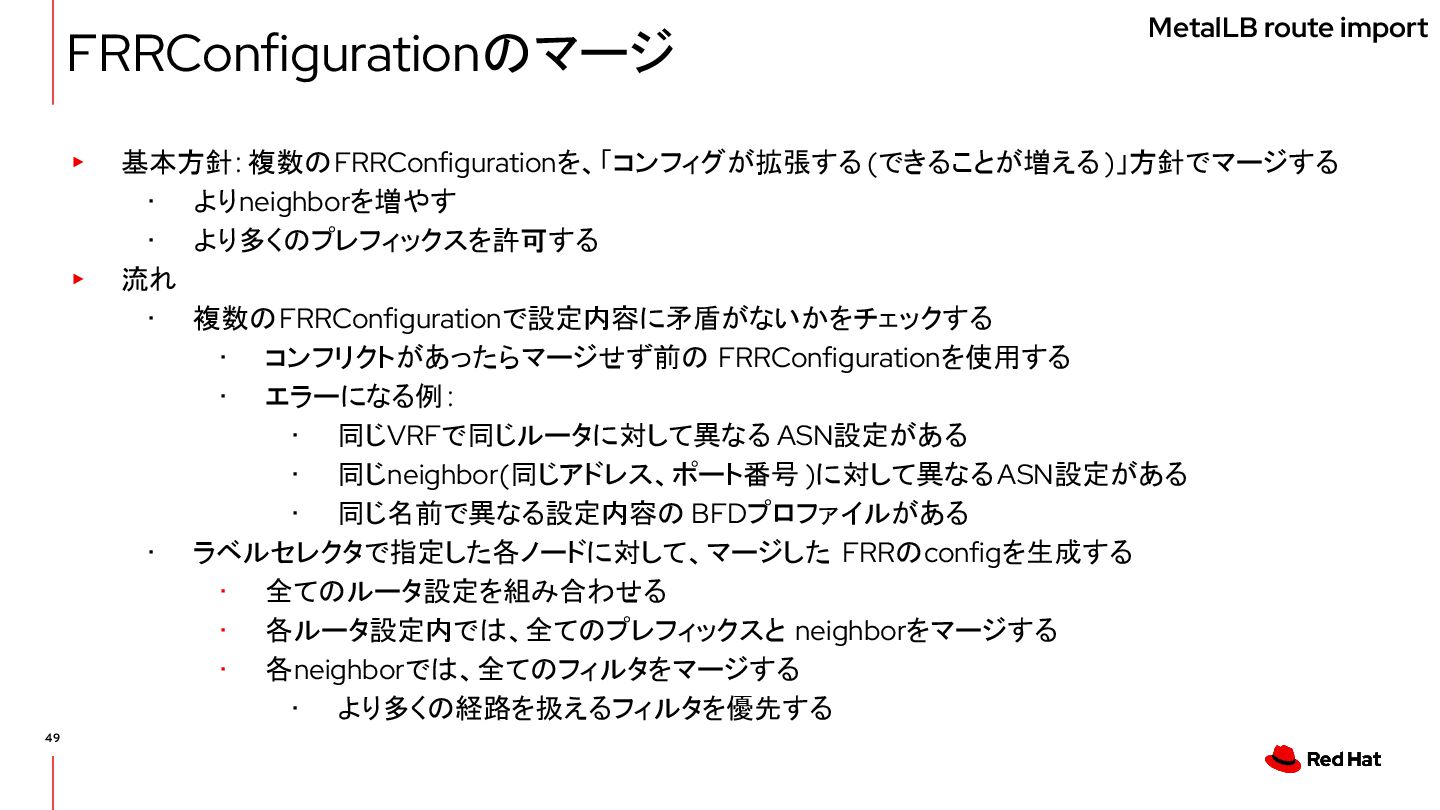 流れ ・ 複数のFRRConfigurationで設定内容に矛盾がないかをチェックする ・ コンフリクトがあったらマージせず前の FRRConfigurationを使用する ・ エラーになる例: ・ 同じVRFで同じルータに対して異なる ASN設定がある ・ 同じneighbor(同じアドレス、ポート番号 )に対して異なるASN設定がある ・ 同じ名前で異なる設定内容の BFDプロファイルがある ・ ラベルセレクタで指定した各ノードに対して、マージした FRRのconfigを生成する ・ 全てのルータ設定を組み合わせる ・ 各ルータ設定内では、全てのプレフィックスと neighborをマージする ・ 各neighborでは、全てのフィルタをマージする ・ より多くの経路を扱えるフィルタを優先する 49 MetalLB route import
