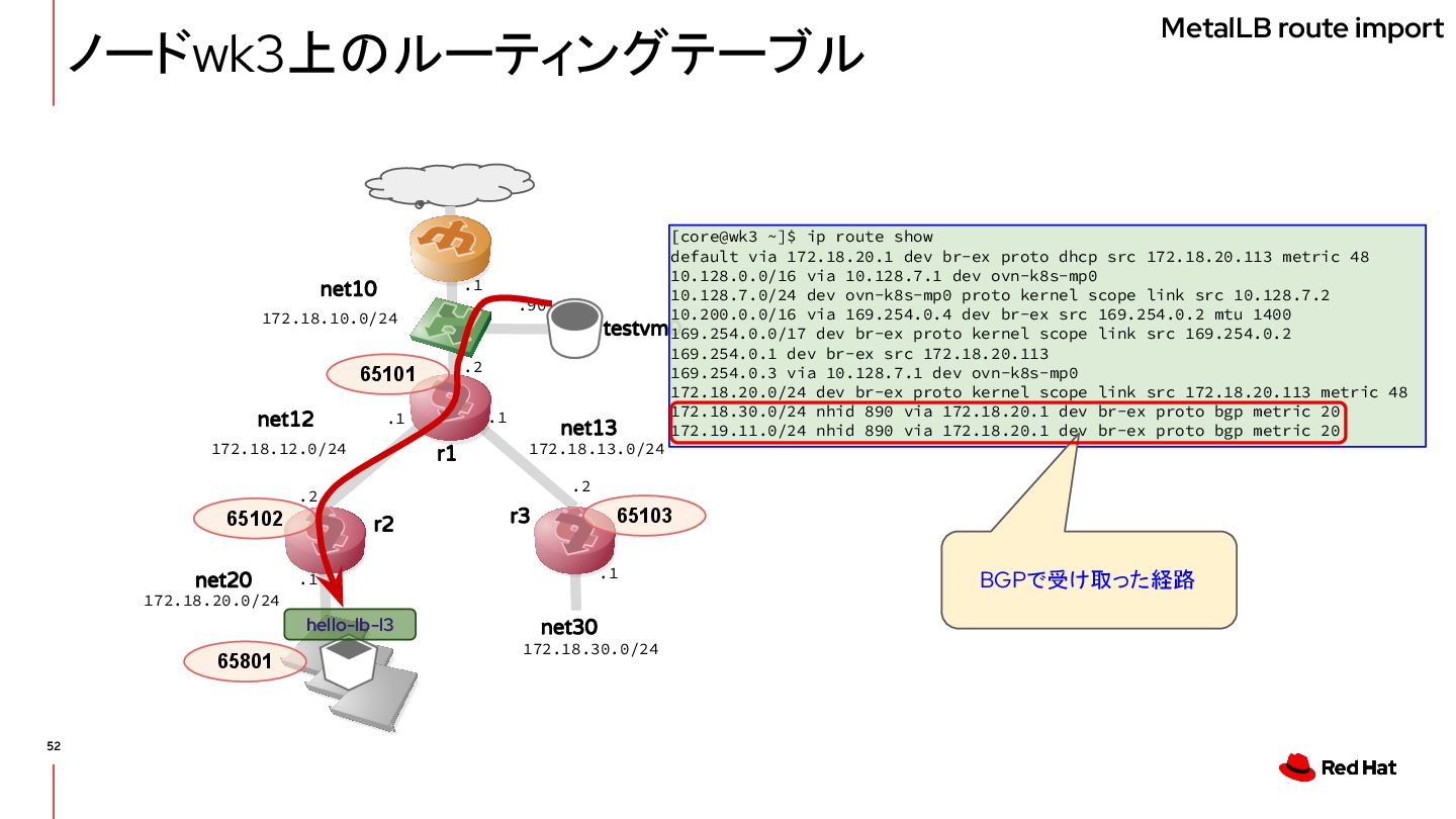 172.18.12.0/24 172.18.13.0/24 172.18.20.0/24 .1 .2 .2 .1 .2 .1 .90 65101 65102 65103 .1 .1 testvm0 net30 172.18.30.0/24 65801 hello-lb-l3 [core@wk3 ~]$ ip route show default via 172.18.20.1 dev br-ex proto dhcp src 172.18.20.113 metric 48 10.128.0.0/16 via 10.128.7.1 dev ovn-k8s-mp0 10.128.7.0/24 dev ovn-k8s-mp0 proto kernel scope link src 10.128.7.2 10.200.0.0/16 via 169.254.0.4 dev br-ex src 169.254.0.2 mtu 1400 169.254.0.0/17 dev br-ex proto kernel scope link src 169.254.0.2 169.254.0.1 dev br-ex src 172.18.20.113 169.254.0.3 via 10.128.7.1 dev ovn-k8s-mp0 172.18.20.0/24 dev br-ex proto kernel scope link src 172.18.20.113 metric 48 172.18.30.0/24 nhid 890 via 172.18.20.1 dev br-ex proto bgp metric 20 172.19.11.0/24 nhid 890 via 172.18.20.1 dev br-ex proto bgp metric 20 BGPで受け取った経路 MetalLB route import