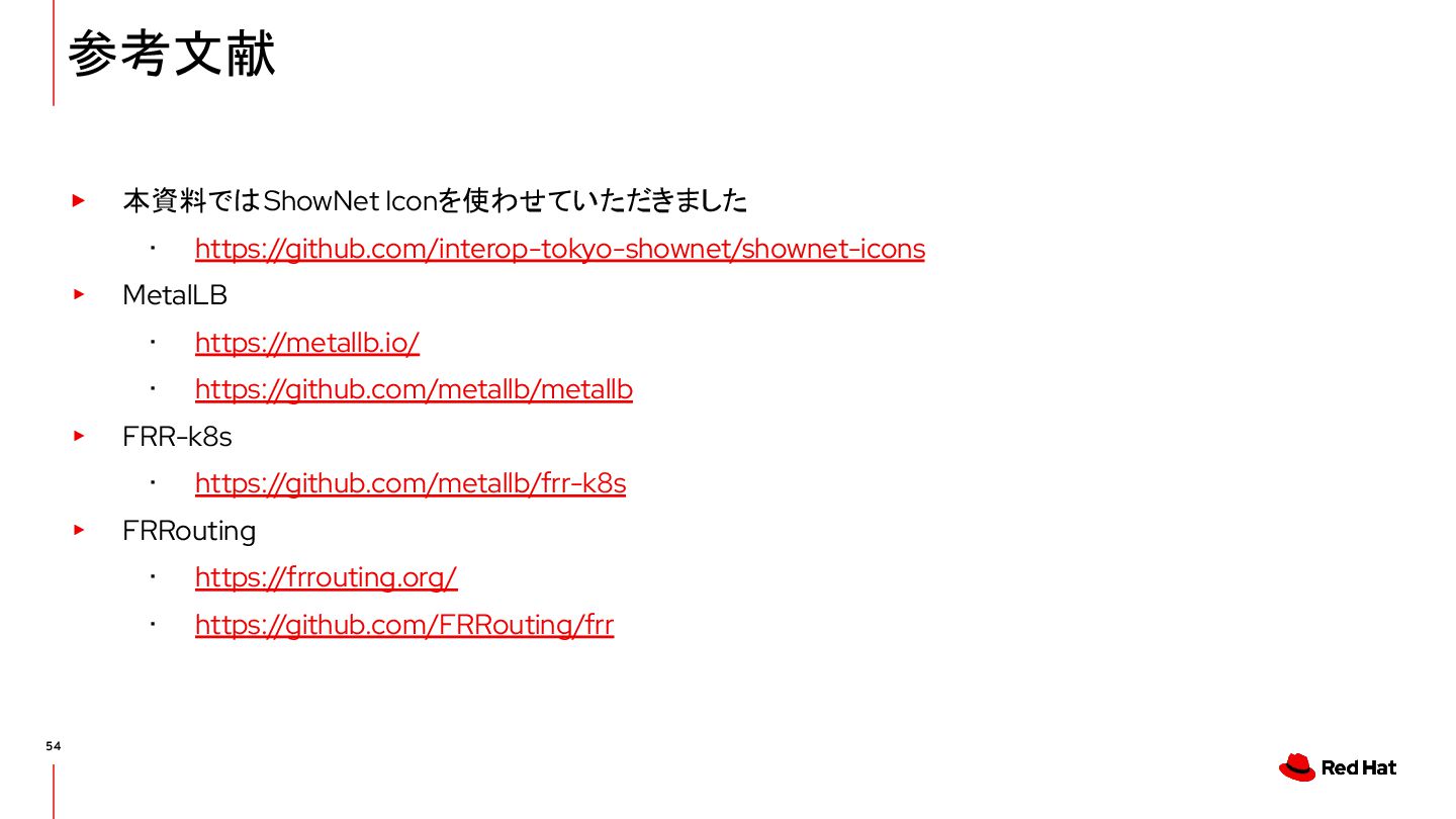 ・ https://github.com/metallb/metallb ▸ FRR-k8s ・ https://github.com/metallb/frr-k8s ▸ FRRouting ・ https://frrouting.org/ ・ https://github.com/FRRouting/frr 54