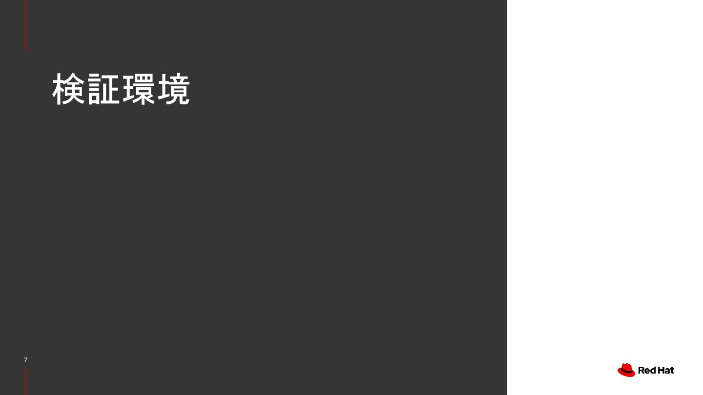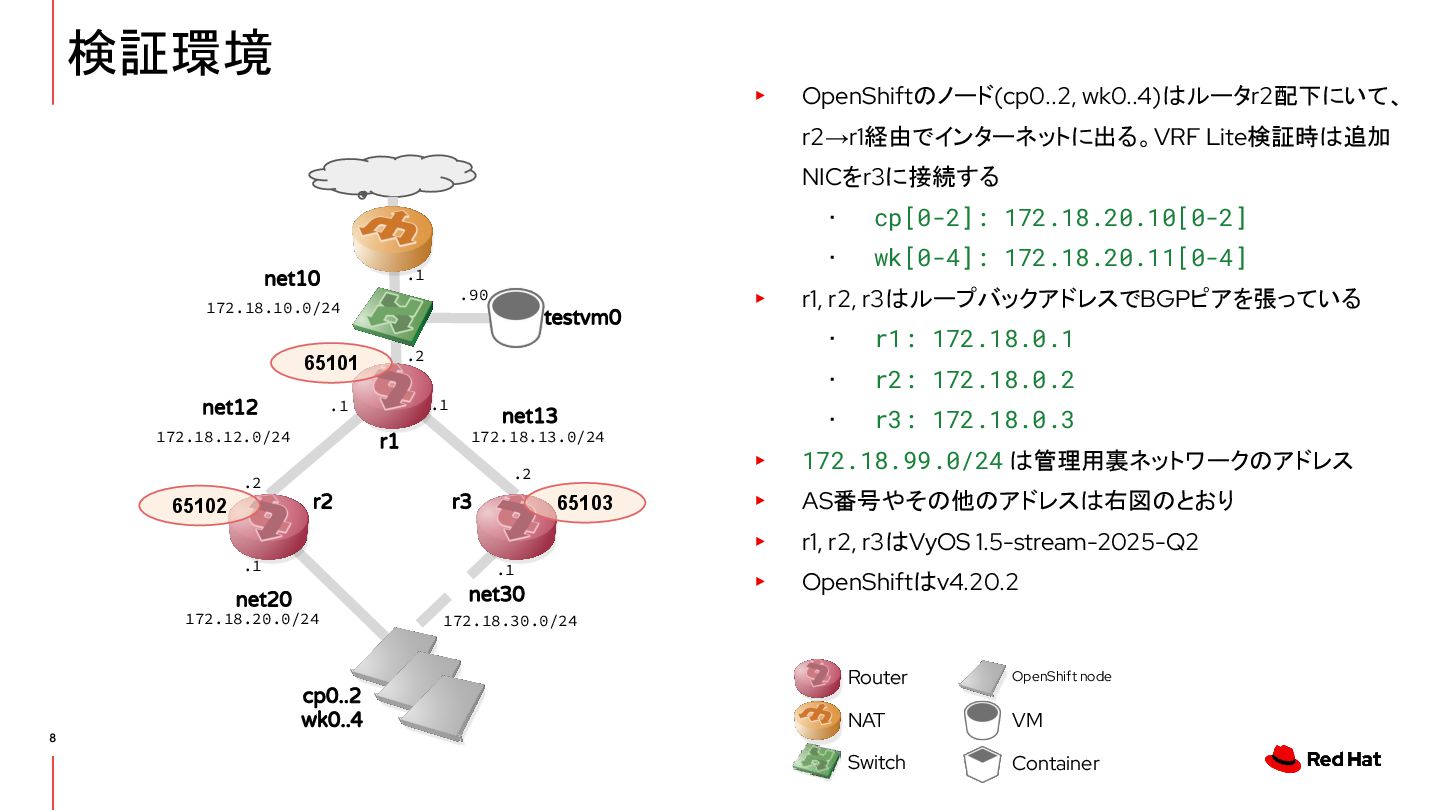 172.18.20.0/24 .1 .2 .2 .1 .2 .1 .90 cp0..2 wk0..4 65101 65102 65103 .1 .1 testvm0 net30 172.18.30.0/24 検証環境 ▸ OpenShiftのノード(cp0..2, wk0..4)はルータr2配下にいて、 r2→r1経由でインターネットに出る。VRF Lite検証時は追加 NICをr3に接続する ・ cp[0-2]: 172.18.20.10[0-2] ・ wk[0-4]: 172.18.20.11[0-4] ▸ r1, r2, r3はループバックアドレスでBGPピアを張っている ・ r1: 172.18.0.1 ・ r2: 172.18.0.2 ・ r3: 172.18.0.3 ▸ 172.18.99.0/24 は管理用裏ネットワークのアドレス ▸ AS番号やその他のアドレスは右図のとおり ▸ r1, r2, r3はVyOS 1.5-stream-2025-Q2 ▸ OpenShiftはv4.20.2 Router NAT Switch OpenShift node VM Container 8