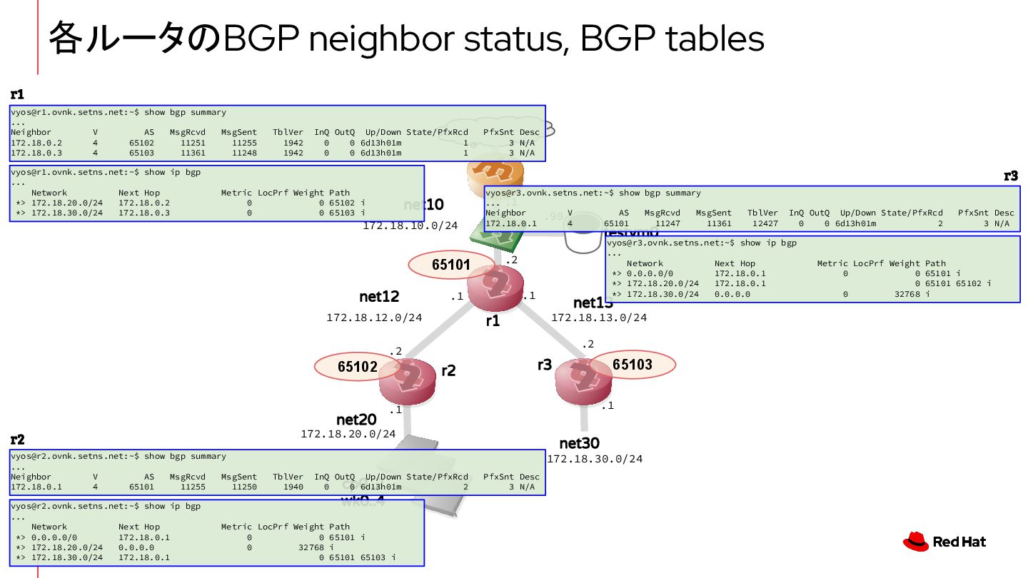172.18.12.0/24 172.18.13.0/24 172.18.20.0/24 .1 .2 .2 .1 .2 .1 .90 65101 65102 65103 .1 .1 testvm0 net30 172.18.30.0/24 65801 hello-lb-l3 $ oc -n openshift-frr-k8s exec -c frr frr-k8s-vk2jh -- vtysh -c 'show ip bgp' BGP table version is 1, local router ID is 172.18.20.113, vrf id 0 Default local pref 100, local AS 65801 Status codes: s suppressed, d damped, h history, * valid, > best, = multipath, i internal, r RIB-failure, S Stale, R Removed Nexthop codes: @NNN nexthop's vrf id, < announce-nh-self Origin codes: i - IGP, e - EGP, ? - incomplete RPKI validation codes: V valid, I invalid, N Not found Network Next Hop Metric LocPrf Weight Path *> 172.19.20.181/32 0.0.0.0 0 32768 i Displayed 1 routes and 1 total paths 対向ルータr2との ピアリング状況 $ oc -n openshift-frr-k8s exec -c frr frr-k8s-vk2jh -- vtysh -c 'show bgp summary' IPv4 Unicast Summary (VRF default): BGP router identifier 172.18.20.113, local AS number 65801 vrf-id 0 BGP table version 1 RIB entries 1, using 192 bytes of memory Peers 1, using 725 KiB of memory Neighbor V AS MsgRcvd MsgSent TblVer InQ OutQ Up/Down State/PfxRcd PfxSnt Desc 172.18.20.1 4 65102 52 45 0 0 0 00:40:07 0 1 N/A Total number of neighbors 1 BGP Adv: MetalLB