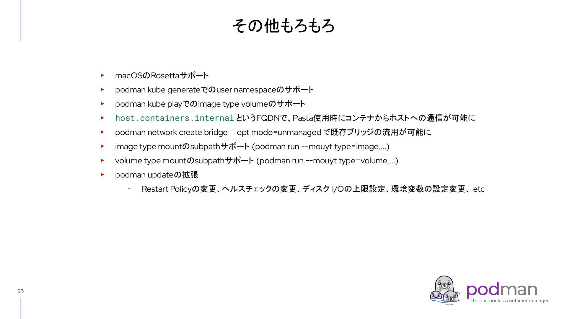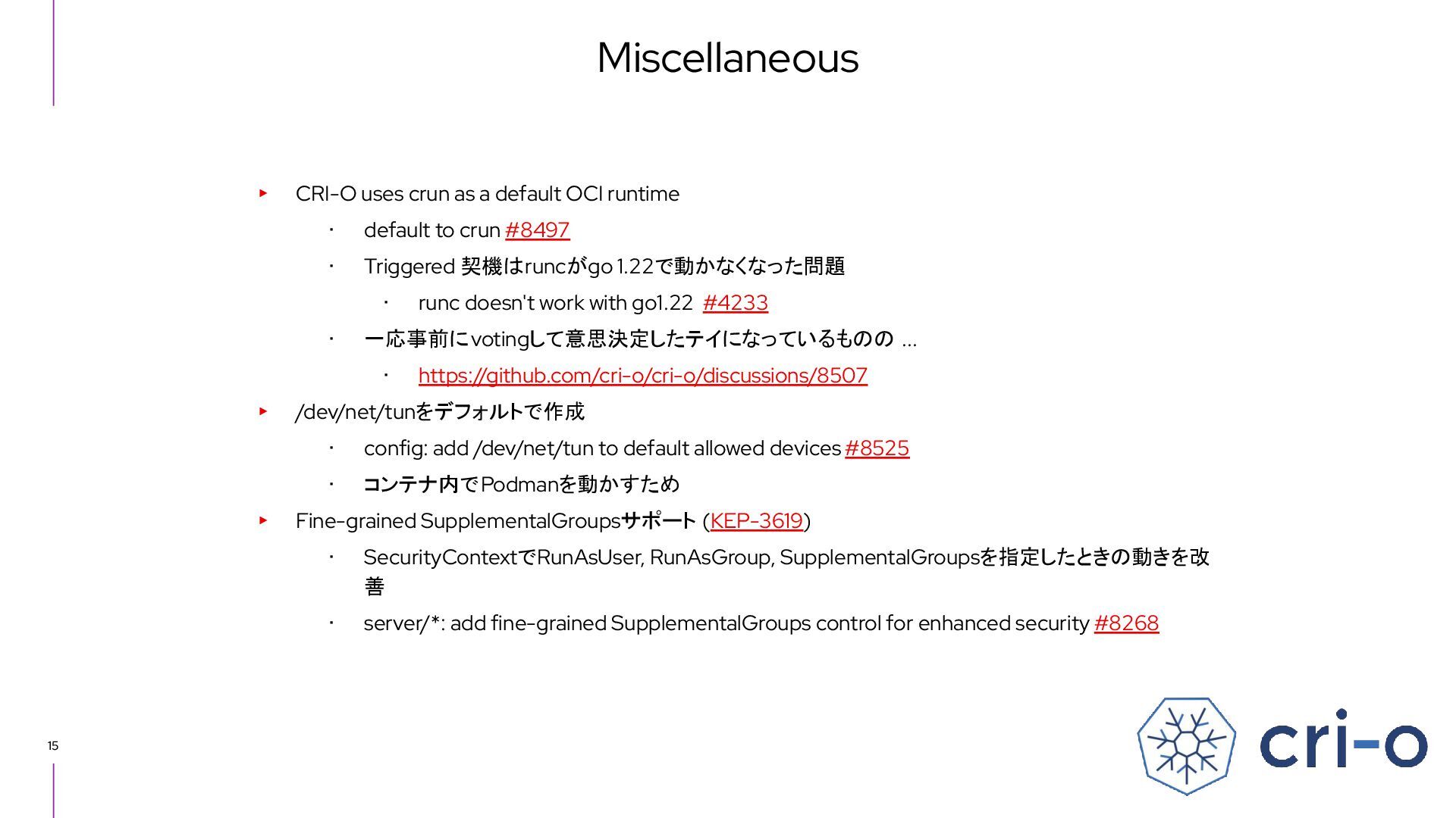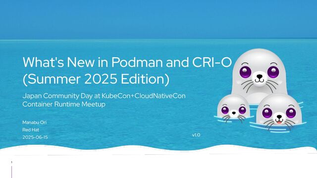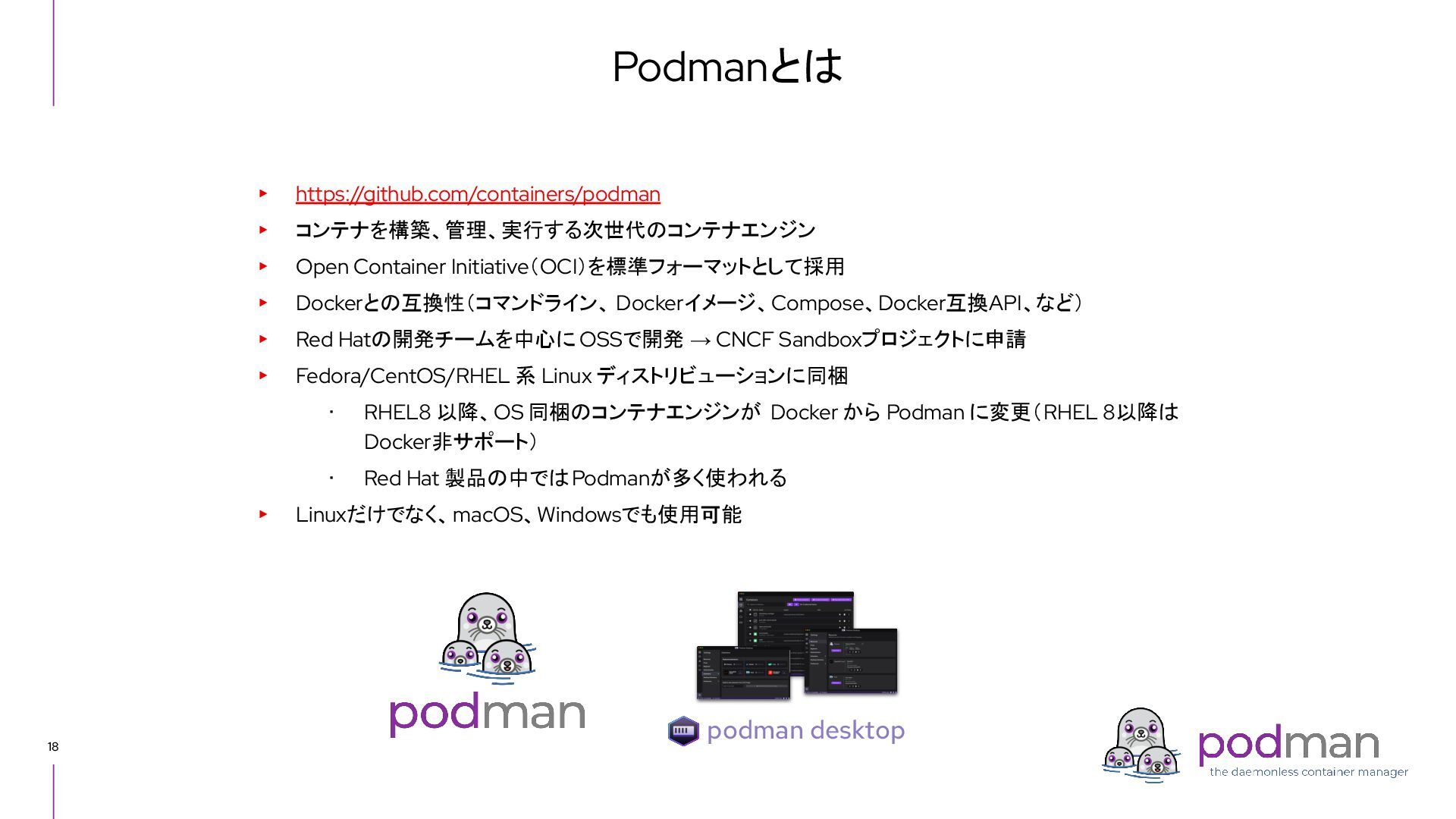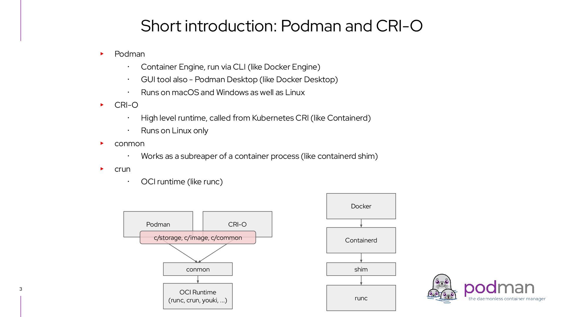 Docker Engine) ・ GUI tool also - Podman Desktop (like Docker Desktop) ・ Runs on macOS and Windows as well as Linux ▸ CRI-O ・ High level runtime, called from Kubernetes CRI (like Containerd) ・ Runs on Linux only ▸ conmon ・ Works as a subreaper of a container process (like containerd shim) ▸ crun ・ OCI runtime (like runc) Short introduction: Podman and CRI-O Podman CRI-O OCI Runtime (runc, crun, youki, ...) Docker Containerd runc c/storage, c/image, c/common shim conmon