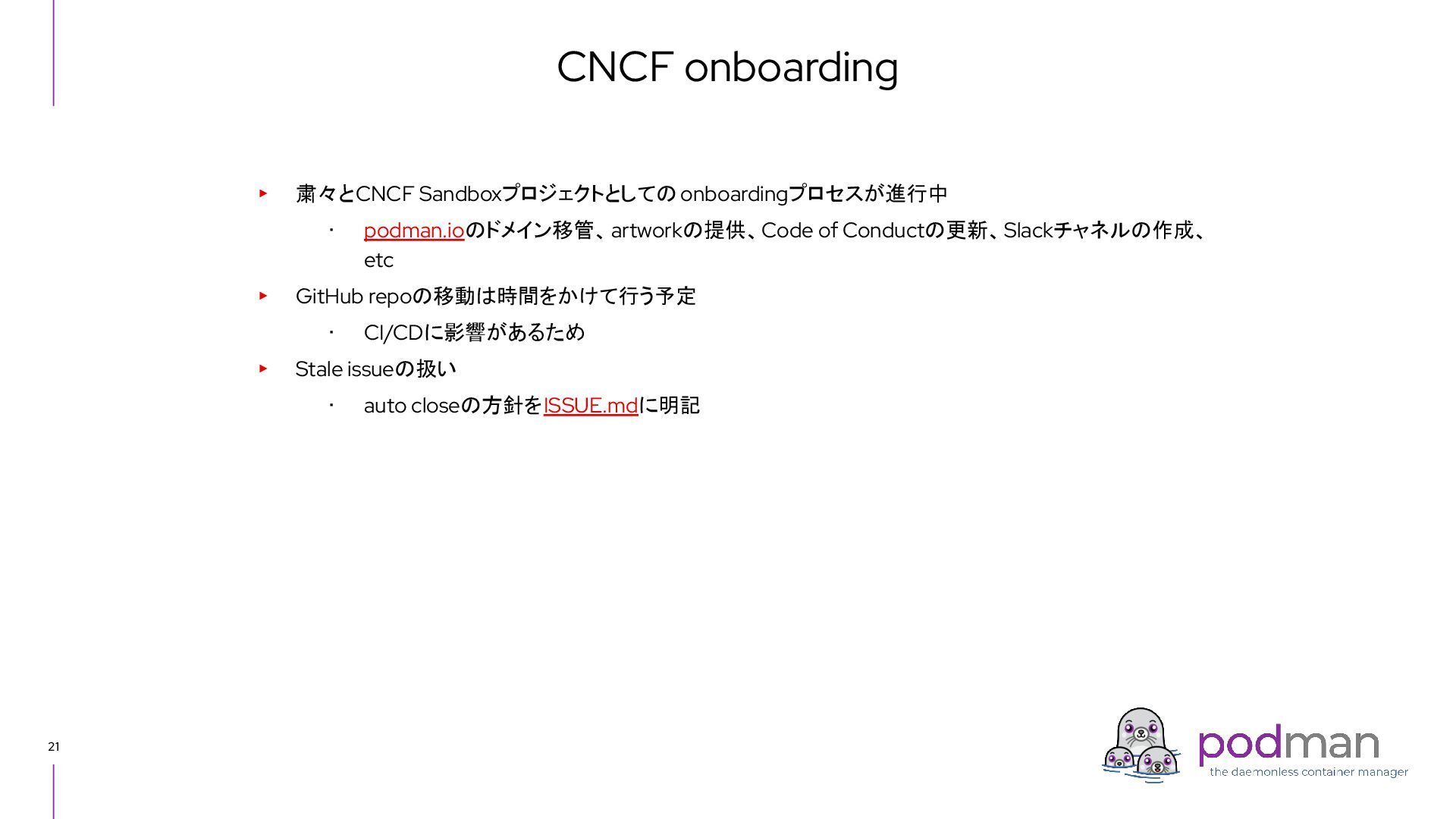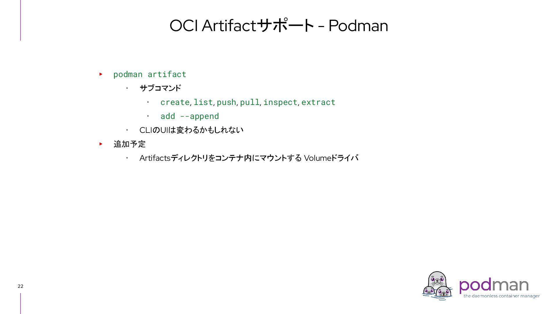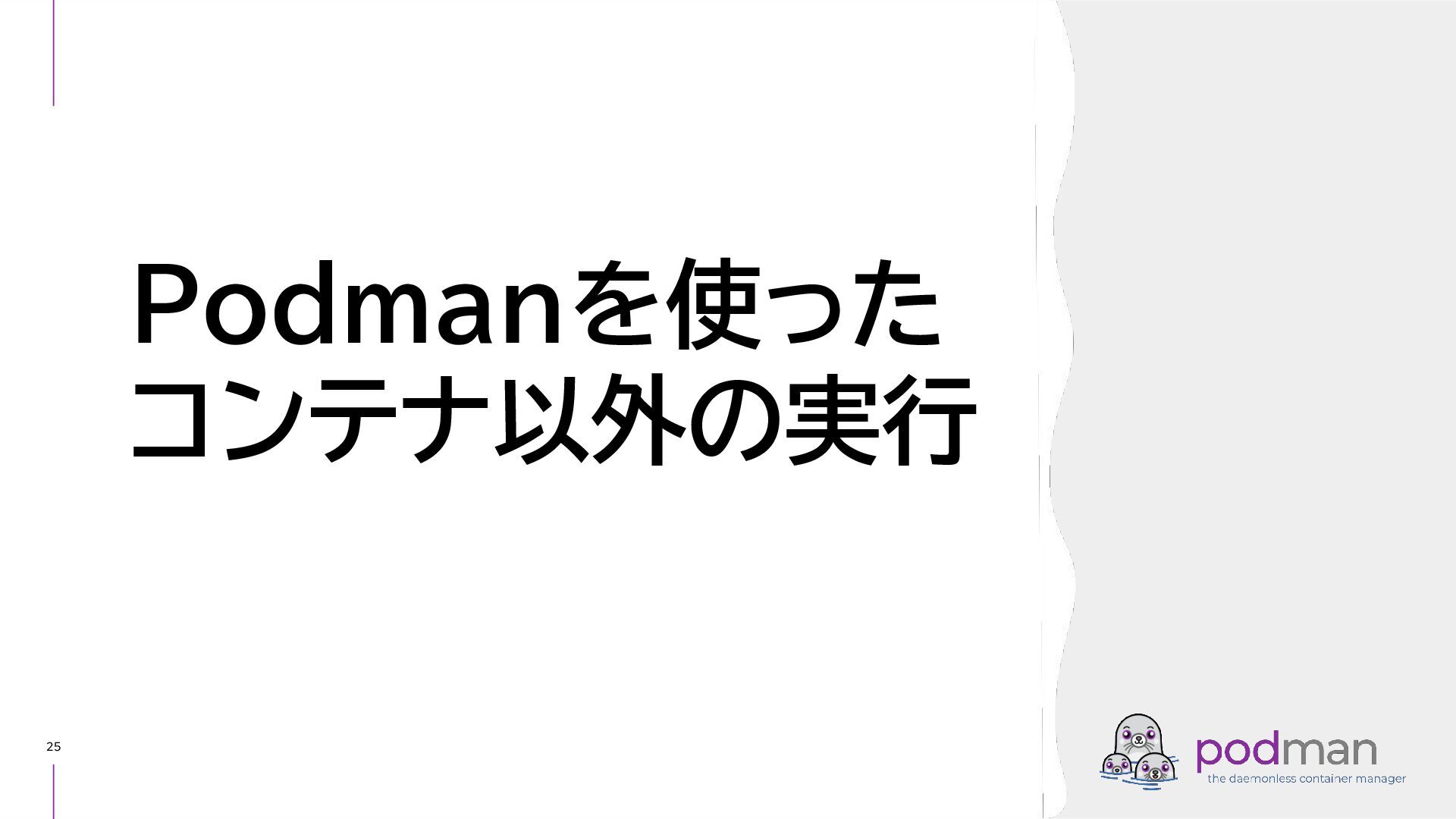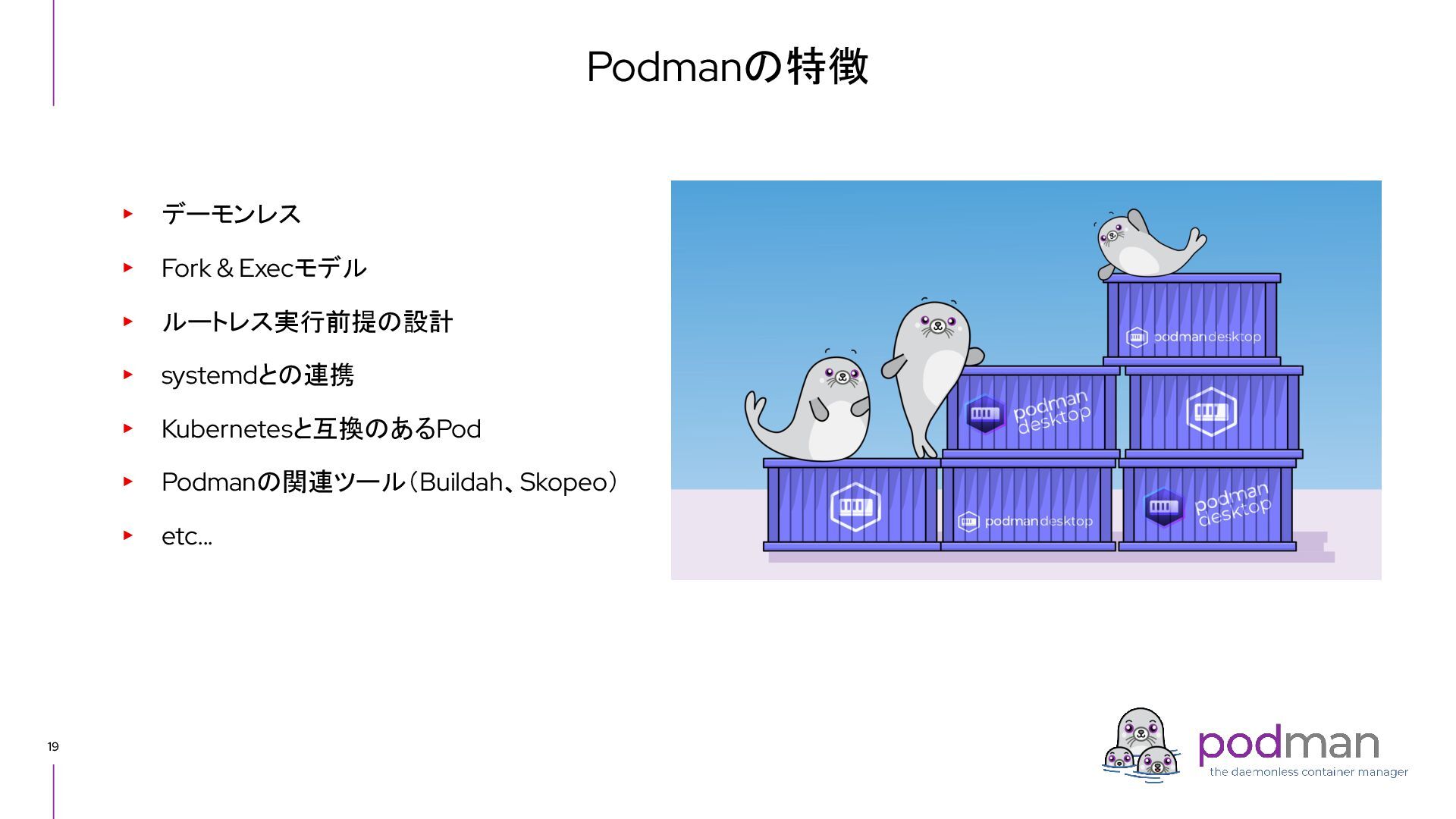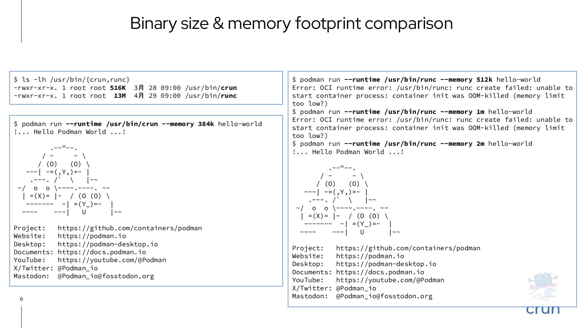 Docker Engine) ・ GUI tool also - Podman Desktop (like Docker Desktop) ・ Runs on macOS and Windows as well as Linux ▸ CRI-O ・ High level runtime, called from Kubernetes CRI (like Containerd) ・ Runs on Linux only ▸ conmon ・ Works as a subreaper of a container process (like containerd shim) ▸ crun ・ OCI runtime (like runc) Short introduction: Podman and CRI-O Podman CRI-O OCI Runtime (runc, crun, youki, ...) Docker Containerd runc c/storage, c/image, c/common shim conmon
