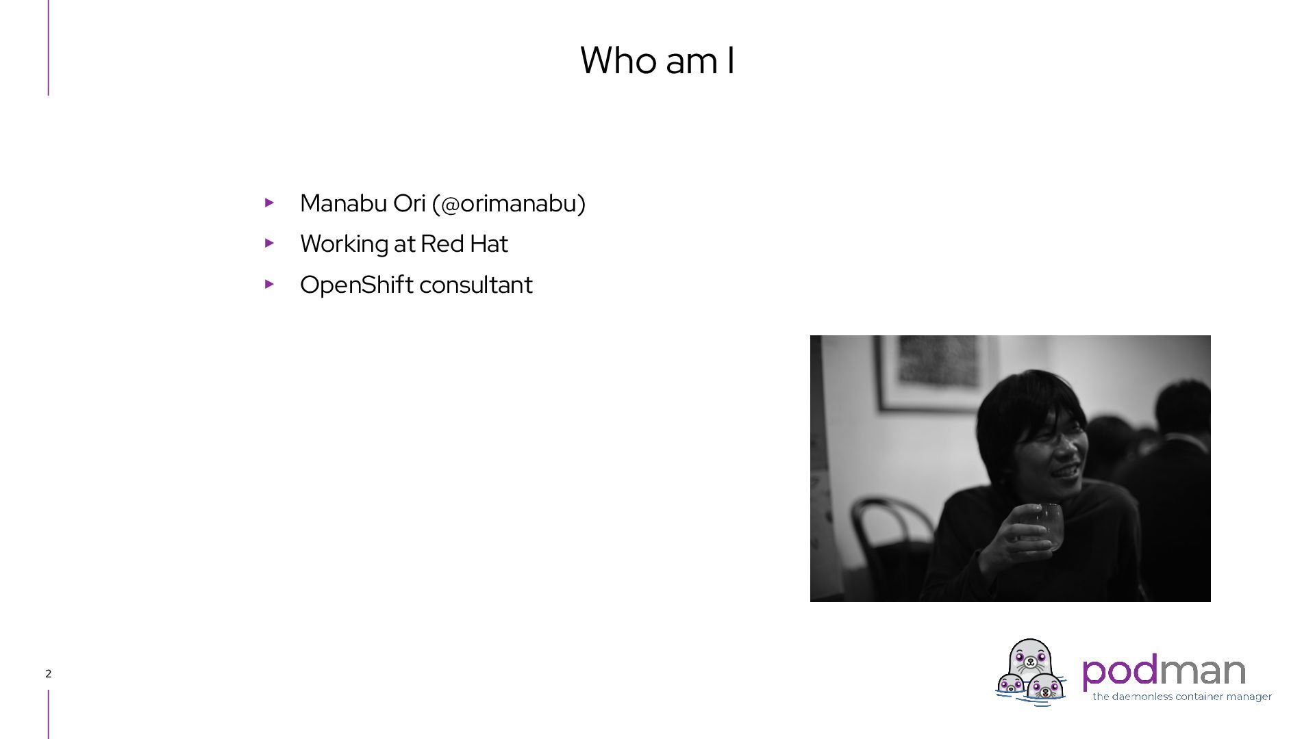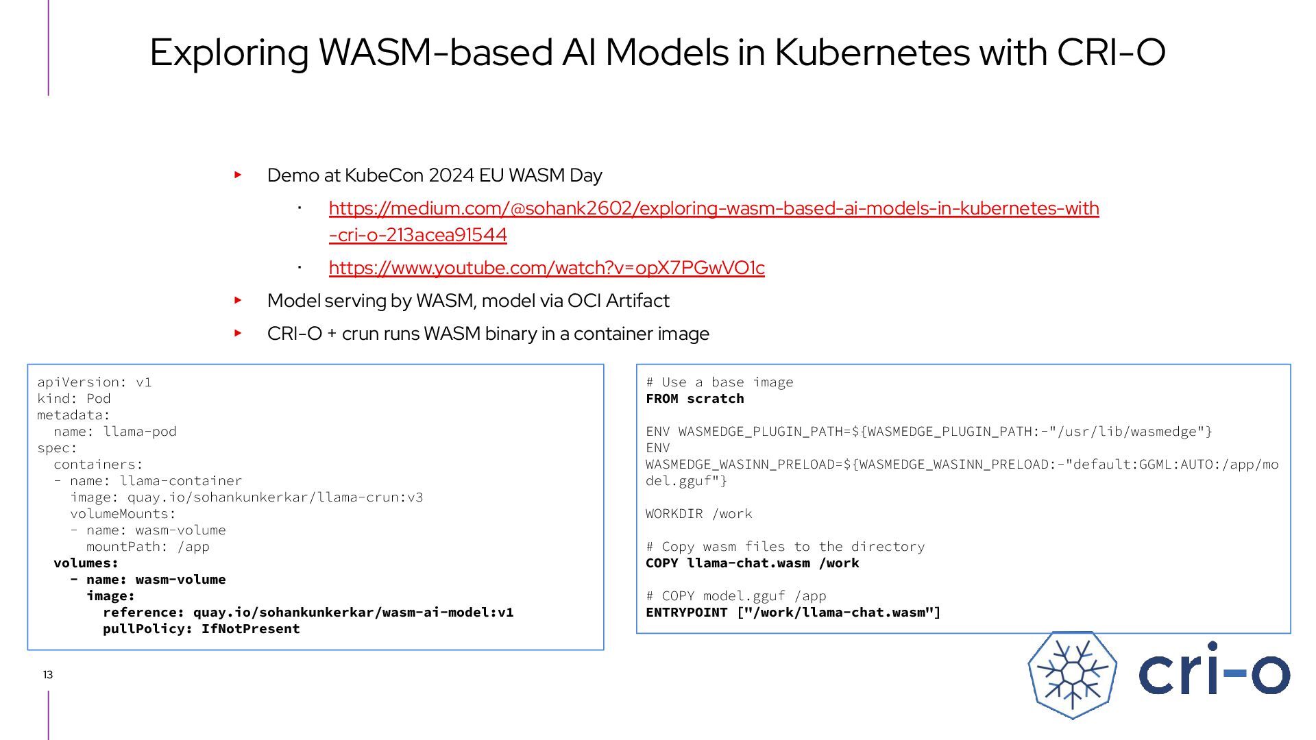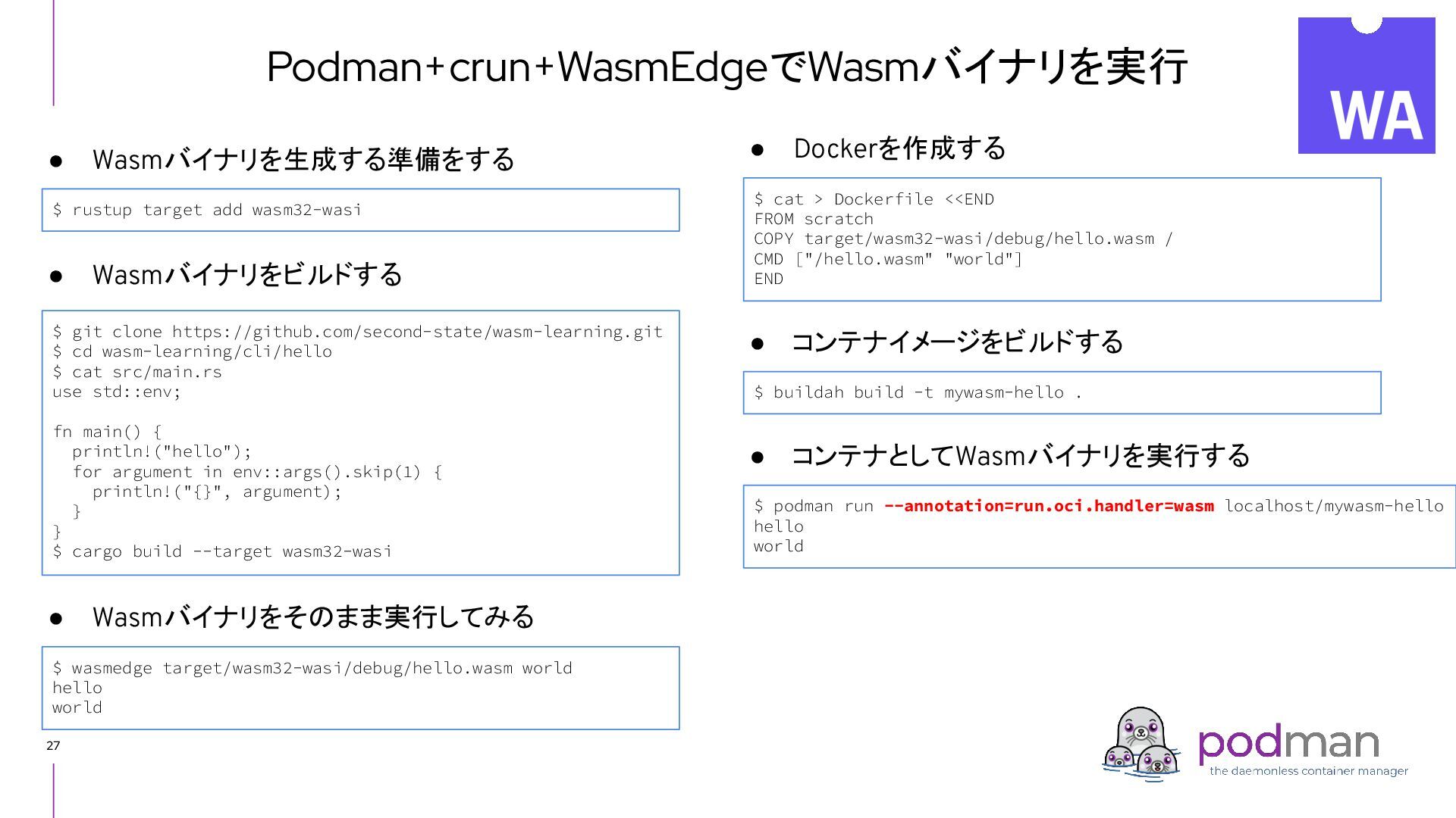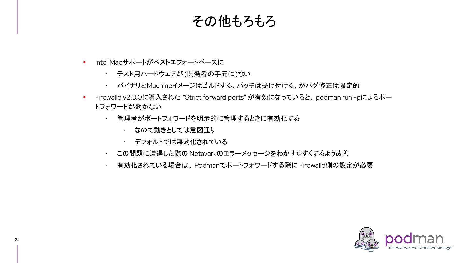 Docker Engine) ・ GUI tool also - Podman Desktop (like Docker Desktop) ・ Runs on macOS and Windows as well as Linux ▸ CRI-O ・ High level runtime, called from Kubernetes CRI (like Containerd) ・ Runs on Linux only ▸ conmon ・ Works as a subreaper of a container process (like containerd shim) ▸ crun ・ OCI runtime (like runc) Short introduction: Podman and CRI-O Podman CRI-O OCI Runtime (runc, crun, youki, ...) Docker Containerd runc c/storage, c/image, c/common shim conmon
