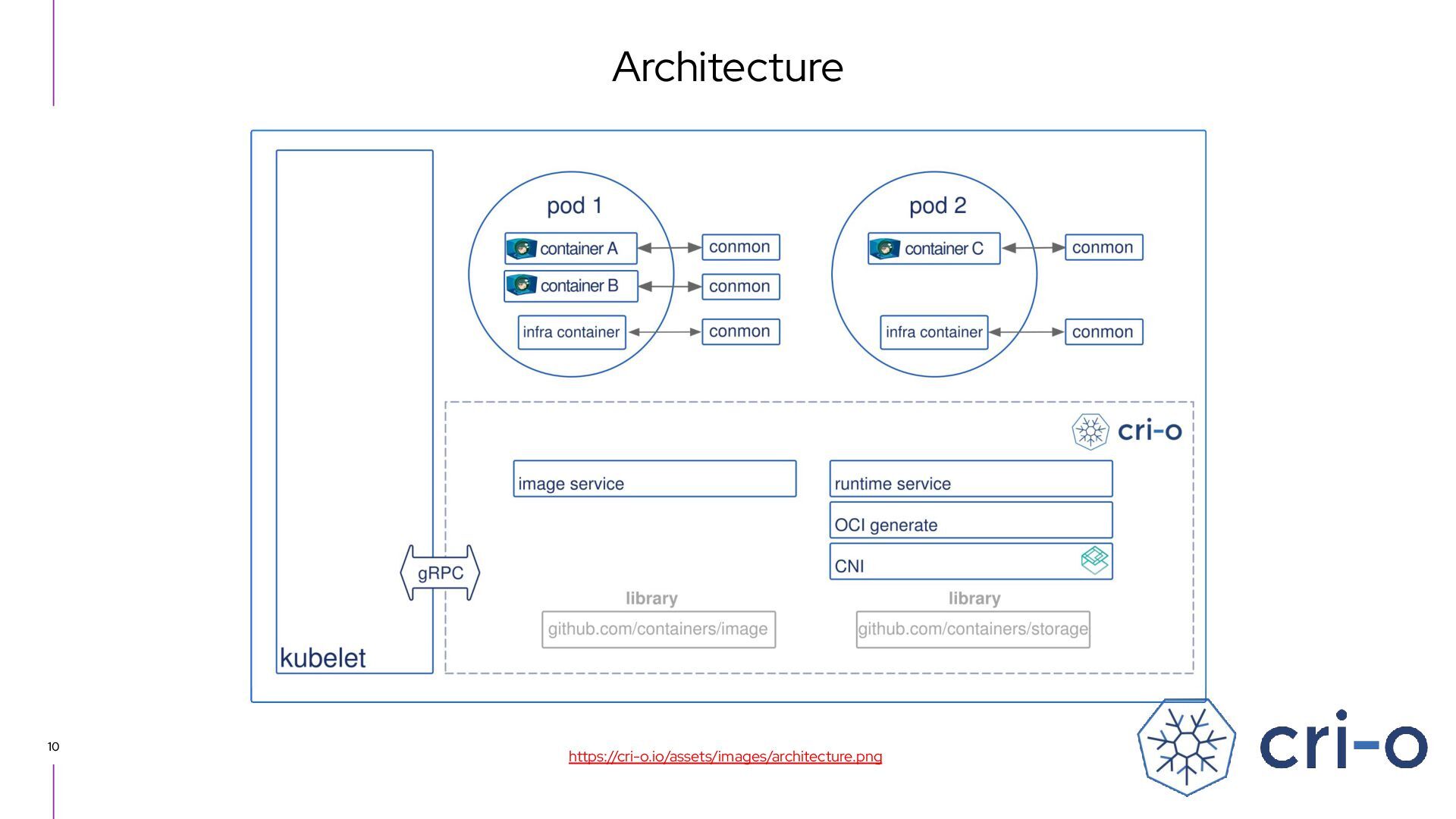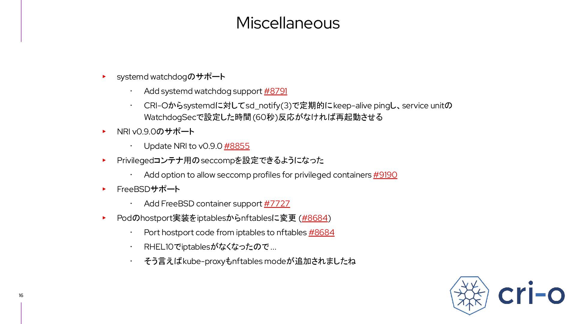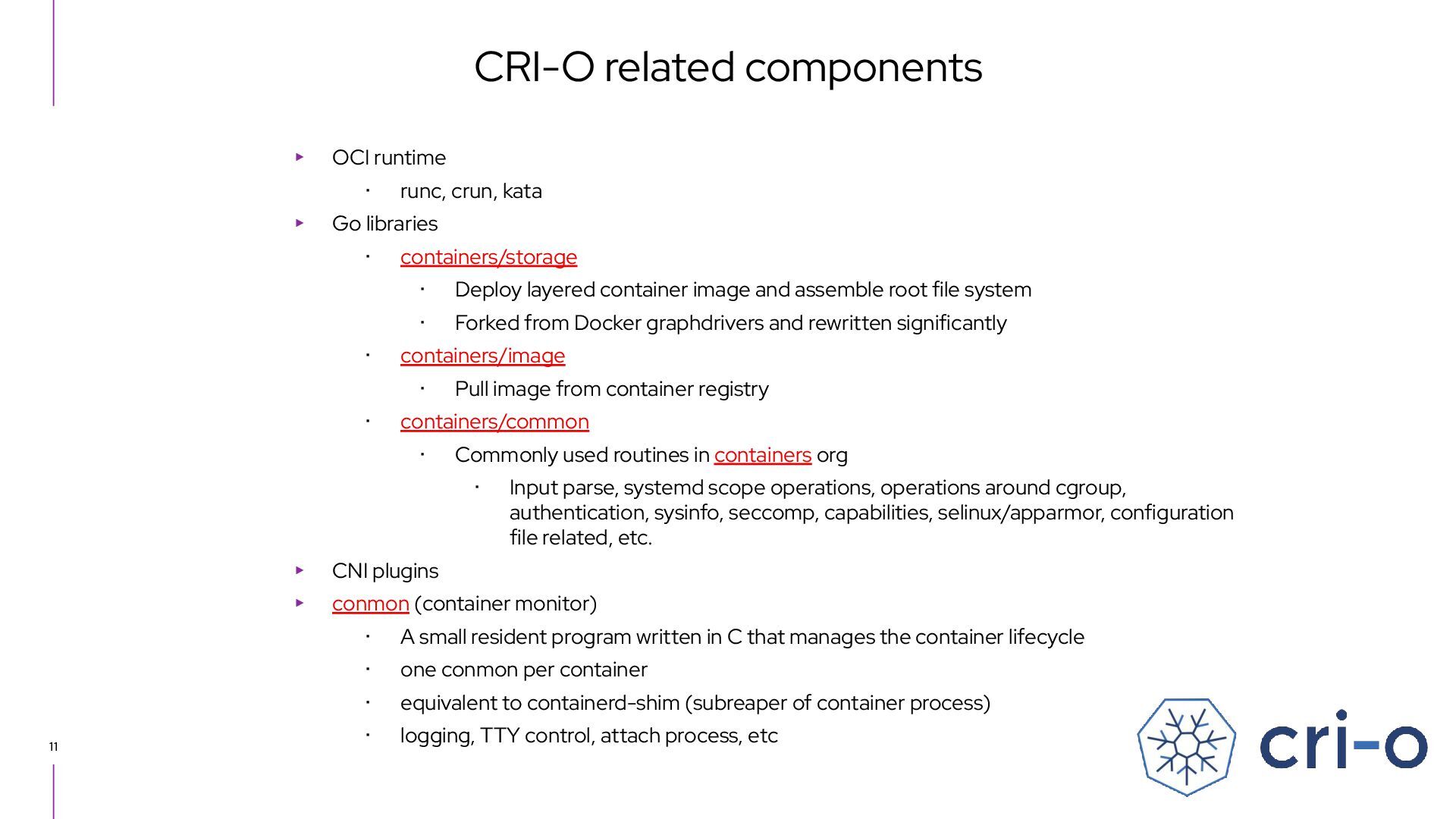 libraries ・ containers/storage ・ Deploy layered container image and assemble root file system ・ Forked from Docker graphdrivers and rewritten significantly ・ containers/image ・ Pull image from container registry ・ containers/common ・ Commonly used routines in containers org ・ Input parse, systemd scope operations, operations around cgroup, authentication, sysinfo, seccomp, capabilities, selinux/apparmor, configuration file related, etc. ▸ CNI plugins ▸ conmon (container monitor) ・ A small resident program written in C that manages the container lifecycle ・ one conmon per container ・ equivalent to containerd-shim (subreaper of container process) ・ logging, TTY control, attach process, etc CRI-O related components