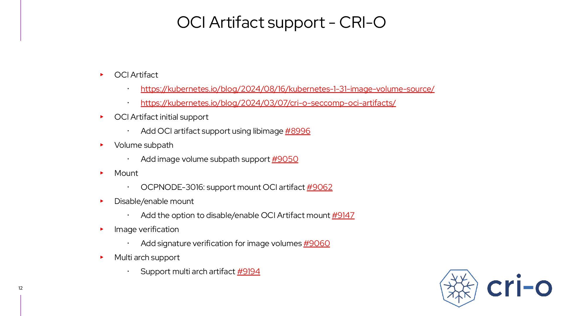 Artifact initial support ・ Add OCI artifact support using libimage #8996 ▸ Volume subpath ・ Add image volume subpath support #9050 ▸ Mount ・ OCPNODE-3016: support mount OCI artifact #9062 ▸ Disable/enable mount ・ Add the option to disable/enable OCI Artifact mount #9147 ▸ Image verification ・ Add signature verification for image volumes #9060 ▸ Multi arch support ・ Support multi arch artifact #9194 OCI Artifact support - CRI-O