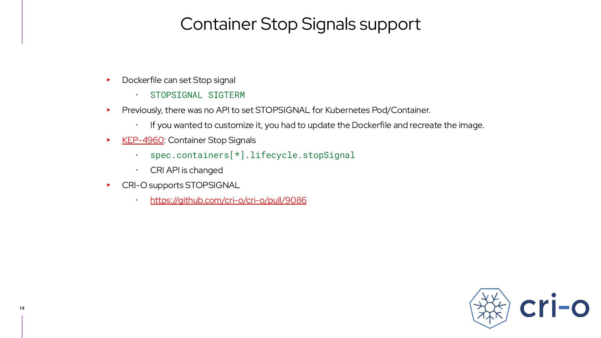 ▸ Previously, there was no API to set STOPSIGNAL for Kubernetes Pod/Container. ・ If you wanted to customize it, you had to update the Dockerfile and recreate the image. ▸ KEP-4960: Container Stop Signals ・ spec.containers[*].lifecycle.stopSignal ・ CRI API is changed ▸ CRI-O supports STOPSIGNAL ・ https://github.com/cri-o/cri-o/pull/9086 Container Stop Signals support