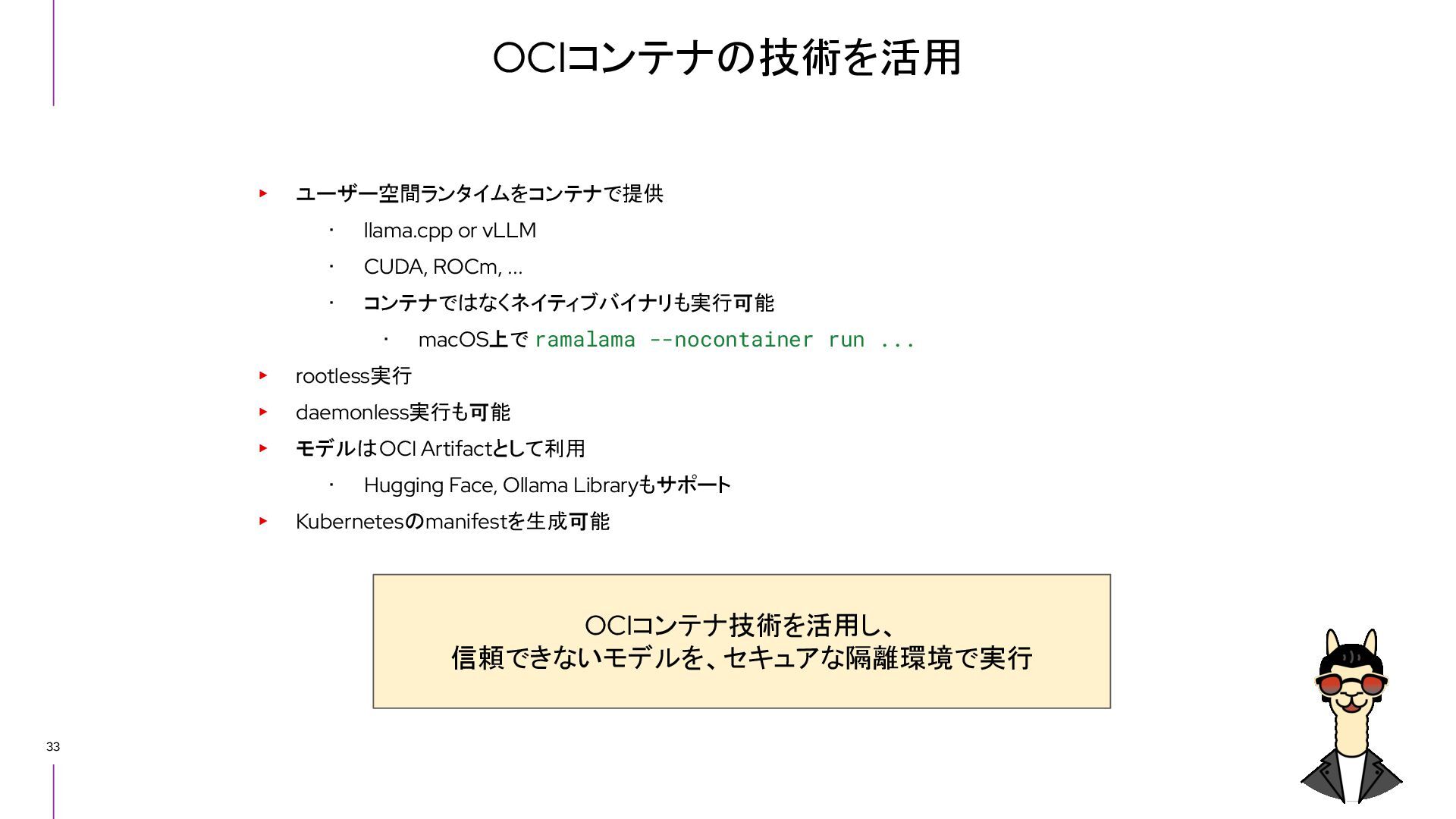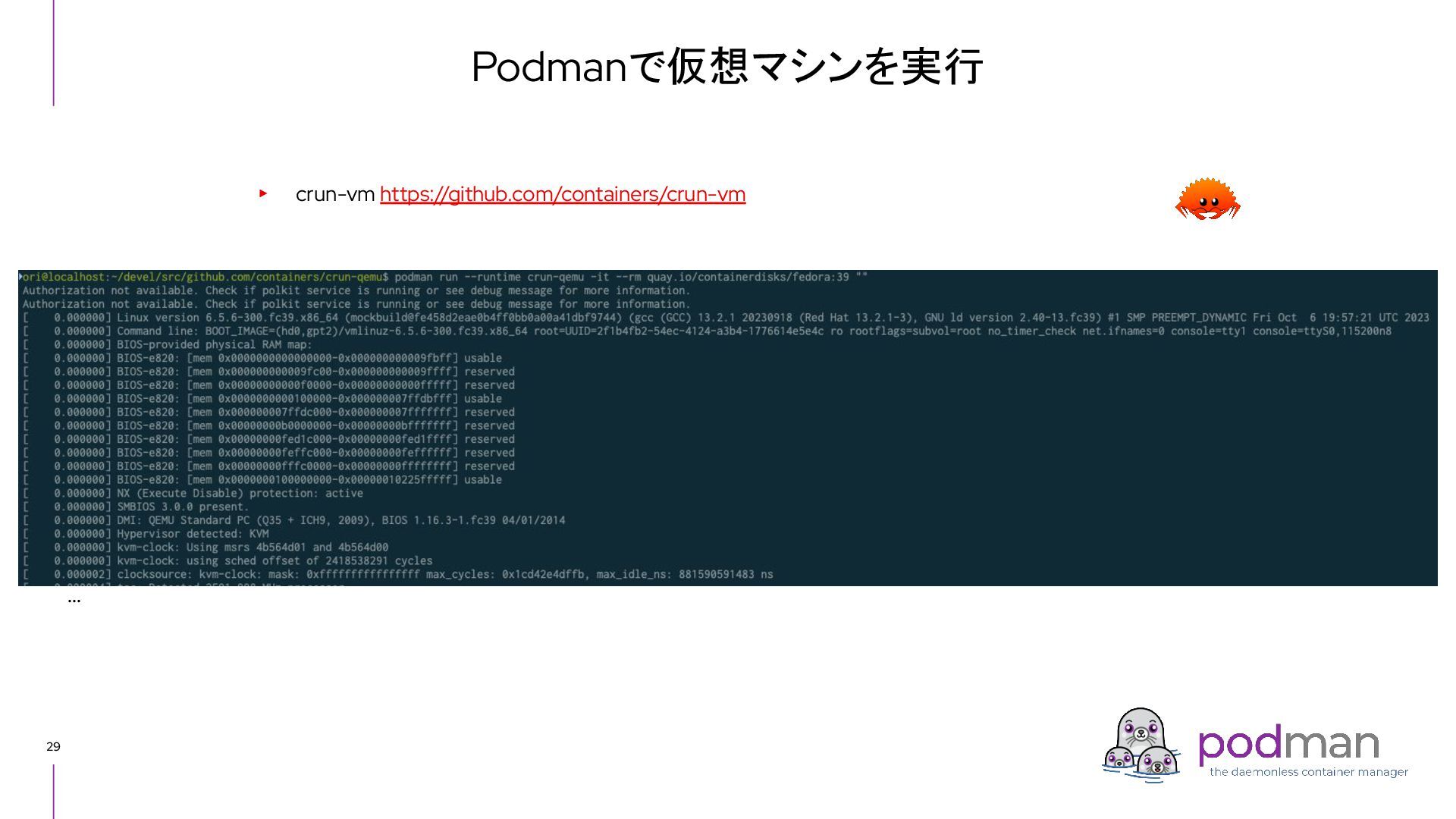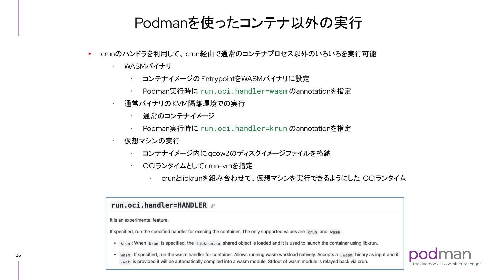 -v /dev/kvm:/dev/kvm \ --annotation=run.oci.handler=krun \ --name nginx nginx • コンテナプロセスのPIDを確認する • KVMの仮想環境でコンテナプロセスが動いていることを確認する $ ls -l /proc/${pid}/fd | grep kvm lrwx------. 1 ori ori 64 Nov 16 00:40 19 -> anon_inode:kvm-vm lrwx------. 1 ori ori 64 Nov 16 00:43 29 -> anon_inode:kvm-vcpu:0 lrwx------. 1 ori ori 64 Nov 16 00:43 31 -> anon_inode:kvm-vcpu:1 lrwx------. 1 ori ori 64 Nov 16 00:43 33 -> anon_inode:kvm-vcpu:2 lrwx------. 1 ori ori 64 Nov 16 00:43 35 -> anon_inode:kvm-vcpu:3 lrwx------. 1 ori ori 64 Nov 16 00:43 37 -> anon_inode:kvm-vcpu:4 lrwx------. 1 ori ori 64 Nov 16 00:43 39 -> anon_inode:kvm-vcpu:5 lrwx------. 1 ori ori 64 Nov 16 00:43 41 -> anon_inode:kvm-vcpu:6 lrwx------. 1 ori ori 64 Nov 16 00:43 43 -> anon_inode:kvm-vcpu:7 $ podman inspect nginx | jq '.[].State.Pid' 190597 $ pid=$(podman inspect nginx | jq '.[].State.Pid') $ ps -p ${pid} f PID TTY STAT TIME COMMAND 190597 ? Ssl 0:00 [libcrun:krun] /docker-entrypoint.sh nginx -g daemon off;
