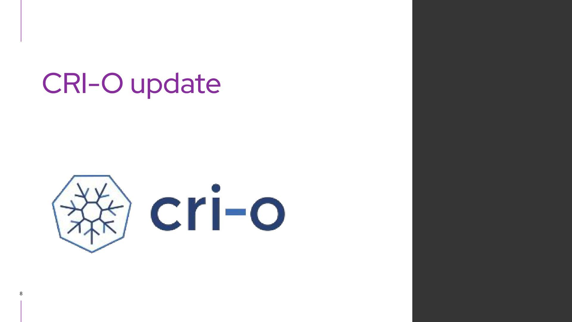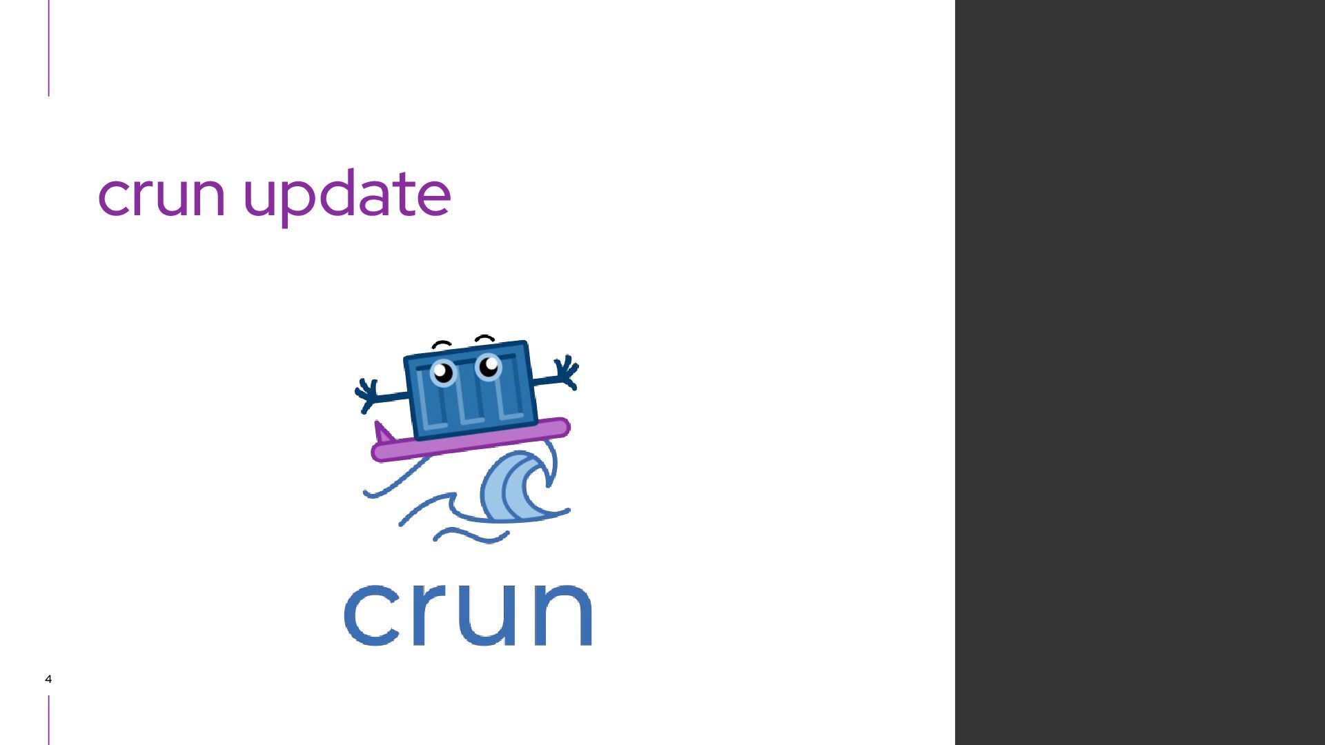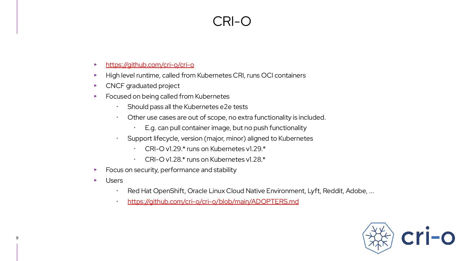 CRI, runs OCI containers ▸ CNCF graduated project ▸ Focused on being called from Kubernetes ・ Should pass all the Kubernetes e2e tests ・ Other use cases are out of scope, no extra functionality is included. ・ E.g. can pull container image, but no push functionality ・ Support lifecycle, version (major, minor) aligned to Kubernetes ・ CRI-O v1.29.* runs on Kubernetes v1.29.* ・ CRI-O v1.28.* runs on Kubernetes v1.28.* ▸ Focus on security, performance and stability ▸ Users ・ Red Hat OpenShift, Oracle Linux Cloud Native Environment, Lyft, Reddit, Adobe, ... ・ https://github.com/cri-o/cri-o/blob/main/ADOPTERS.md CRI-O