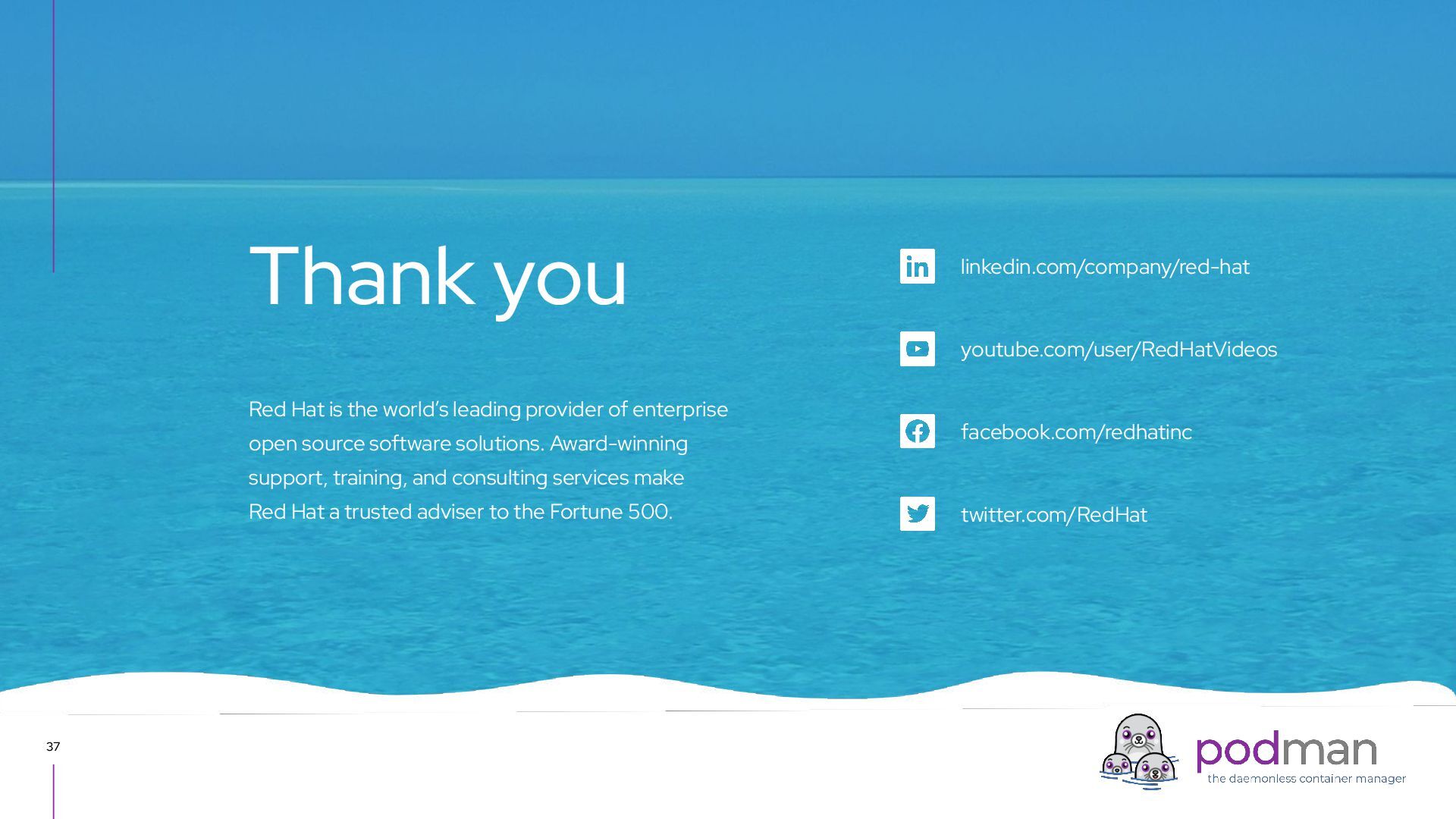 leading provider of enterprise open source software solutions. Award-winning support, training, and consulting services make Red Hat a trusted adviser to the Fortune 500. Thank you