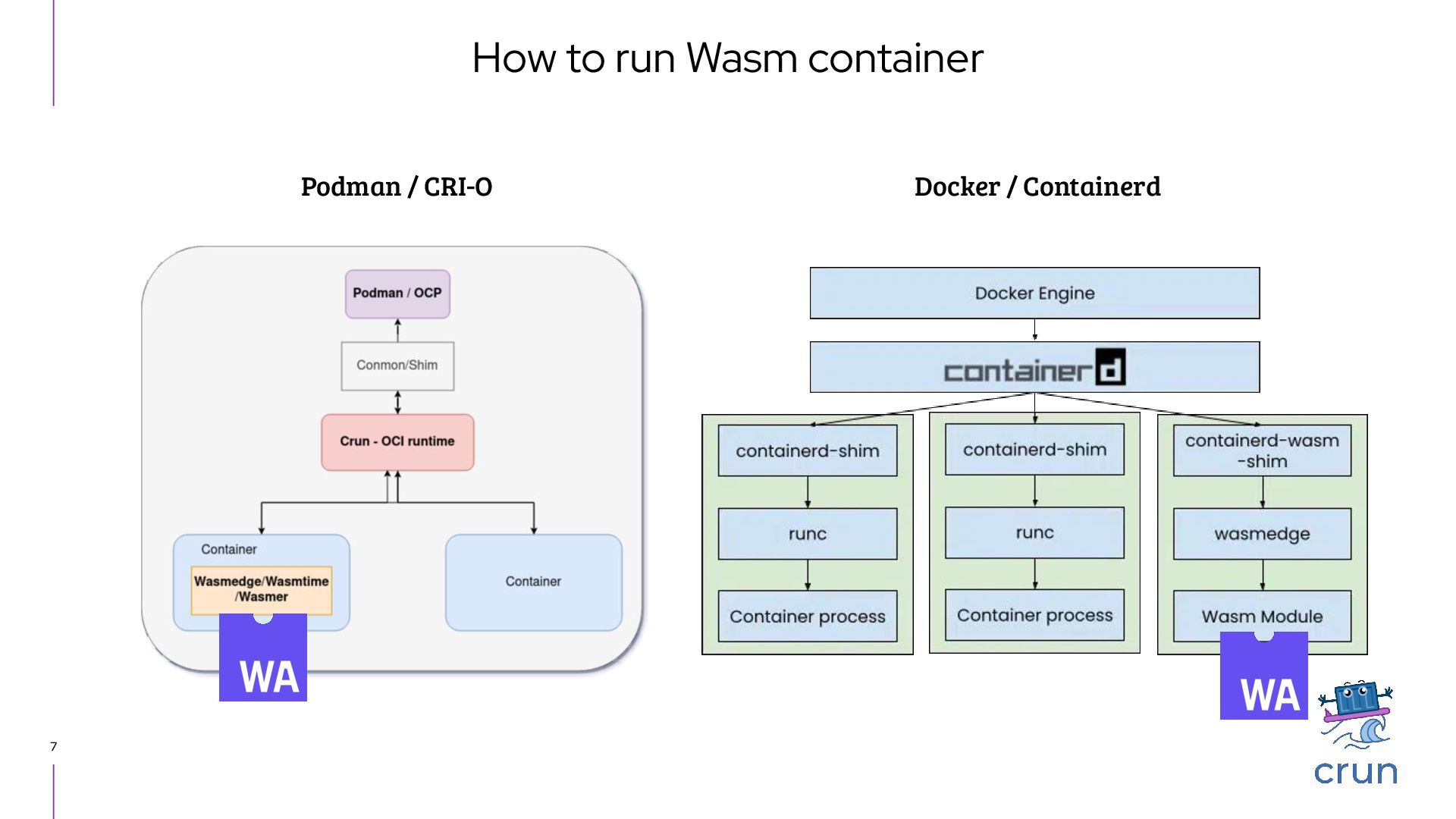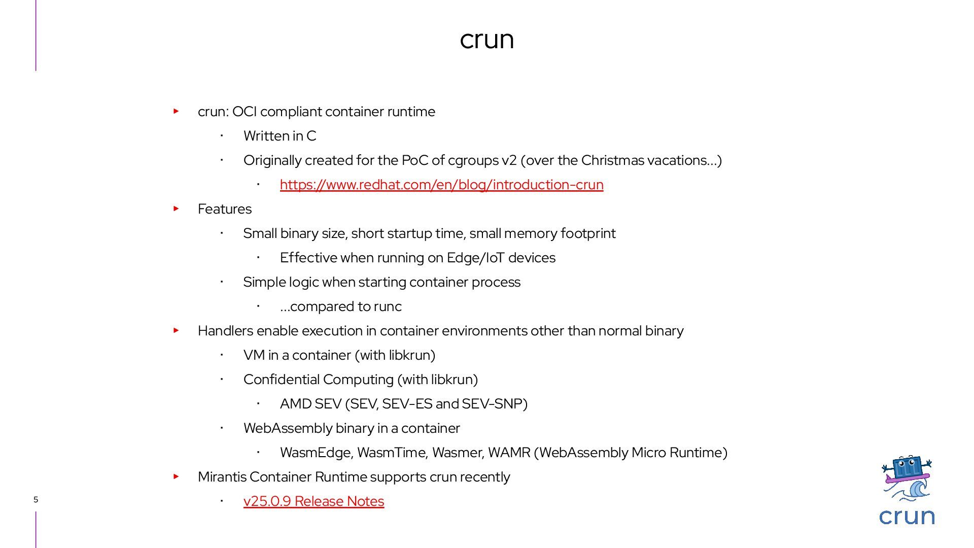 C ・ Originally created for the PoC of cgroups v2 (over the Christmas vacations...) ・ https://www.redhat.com/en/blog/introduction-crun ▸ Features ・ Small binary size, short startup time, small memory footprint ・ Effective when running on Edge/IoT devices ・ Simple logic when starting container process ・ ...compared to runc ▸ Handlers enable execution in container environments other than normal binary ・ VM in a container (with libkrun) ・ Confidential Computing (with libkrun) ・ AMD SEV (SEV, SEV-ES and SEV-SNP) ・ WebAssembly binary in a container ・ WasmEdge, WasmTime, Wasmer, WAMR (WebAssembly Micro Runtime) ▸ Mirantis Container Runtime supports crun recently ・ v25.0.9 Release Notes crun