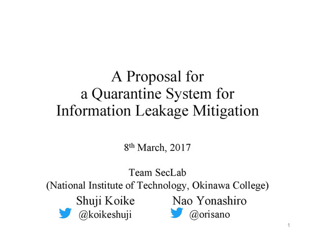 problem, and in order to prevent information leakage, we built a system to prevent malware from expanding its influence, in the network itself. •This system utilizes an algorithm for detecting anomalies based on the communication tendencies of clients. •Future tasks •TCP fragment packet processing •Evaluate the system with actual malware •Detect encrypted backdoor communications •Consider a response method other than packet drop 27