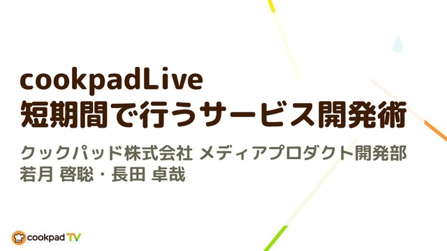 2019/10/30 に恵比寿ガーデンプレイスクックパッド社で行った「クックパッドはサービスの作り手を採用したいんです。〜クックパッド採用説明会 vol.2〜」の登壇資料です。 https://cookpad.connpass.com/event/149581/ CookpadTV 株式会社の若月・長田で、cookpadLive のサービスづくりの進め方を実例を踏まえながら紹介させていただきました。
