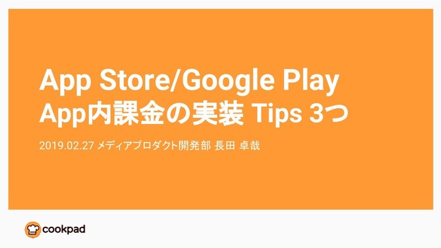 App Store/Google Play App内課金の実装 Tips 3つ 2019.02.27 メディアプロダクト開発部 長田 卓哉