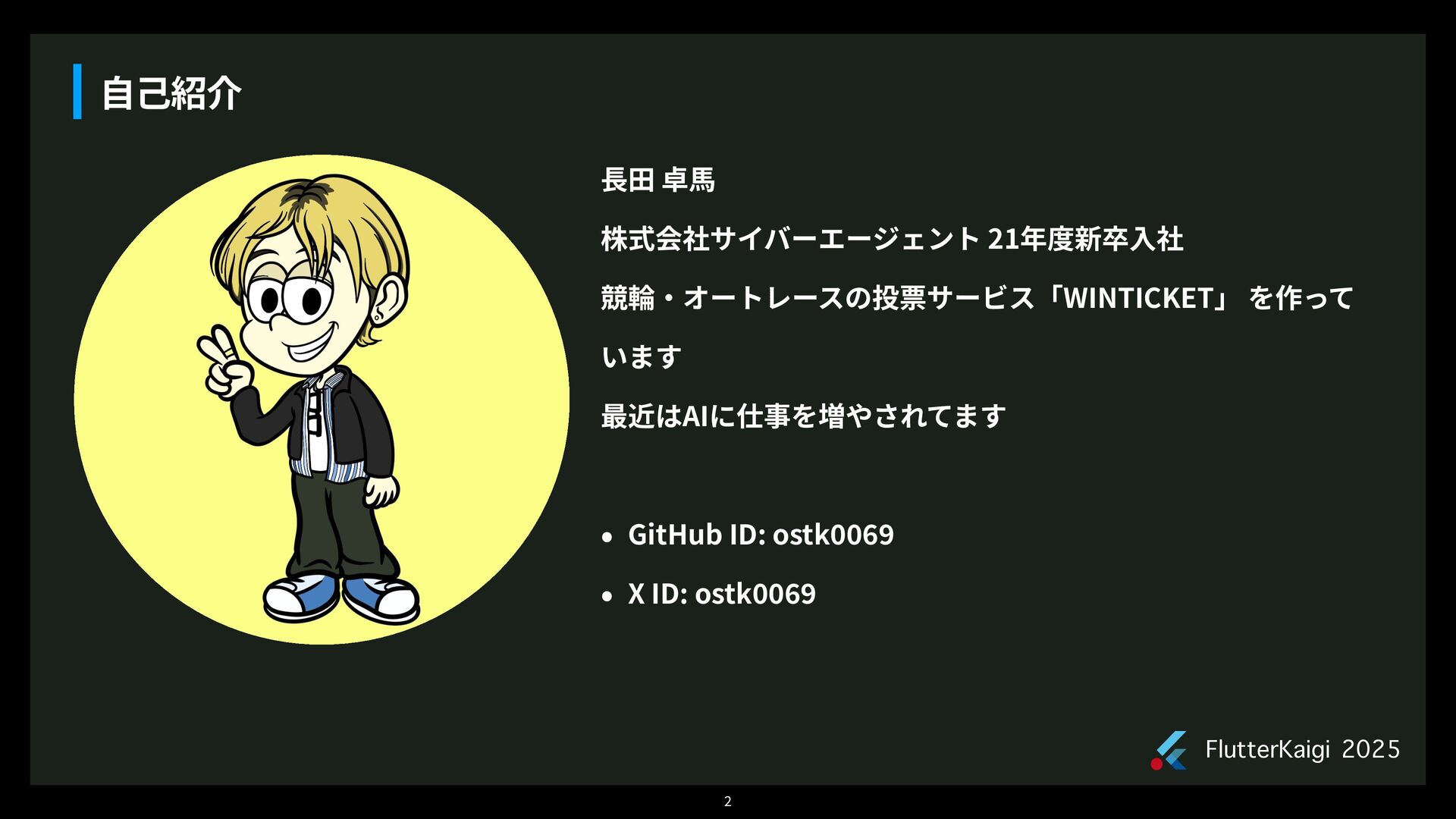 1. FlutterKaigi 2025 2 自 己 紹介 長田 卓 馬 株式会社サイバーエージェント