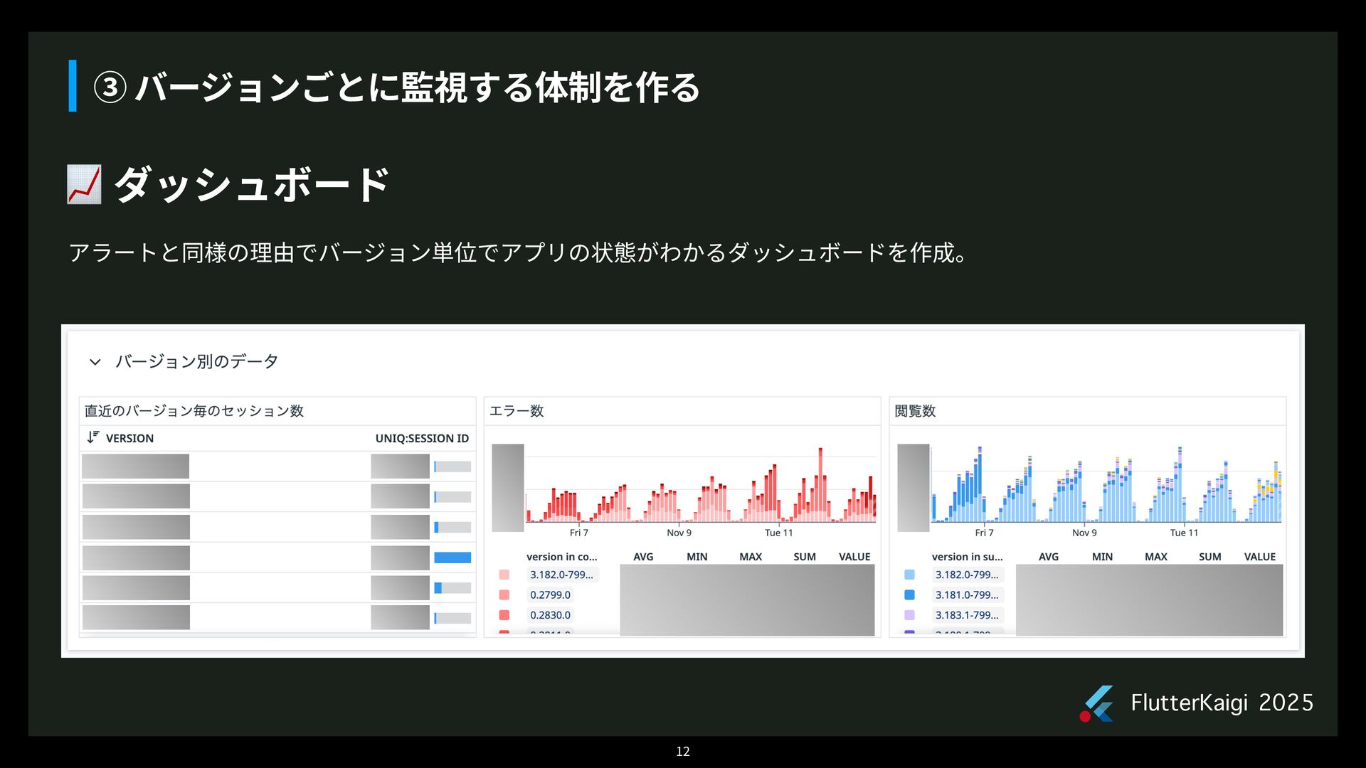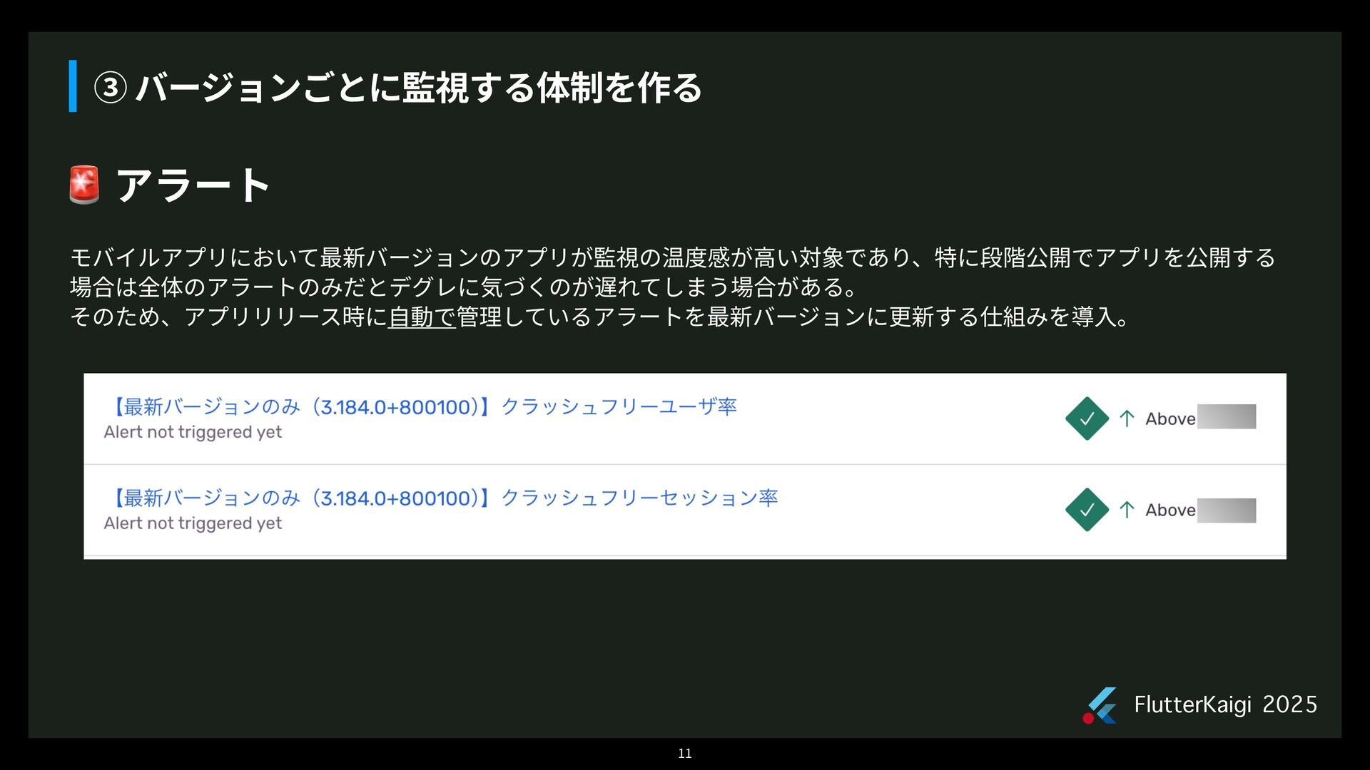 7. FlutterKaigi 2025 1 1 ③ バージョンごとに監視する体制を作る 🚨 アラート モバイルアプリにおいて最新バージョンのアプリが監視の温度感が 高