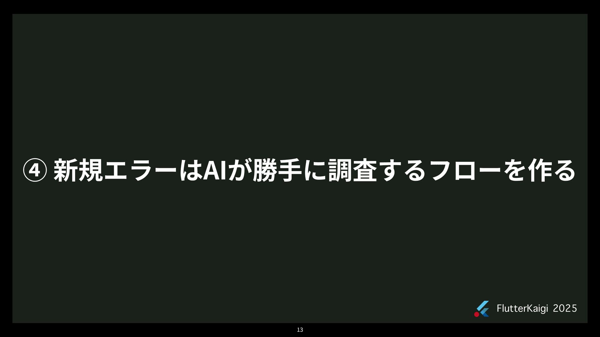 8. FlutterKaigi 2025 1 4 ④ 新規エラーはAIが勝 手 に調査するフローを作る 🔥 エラーが発