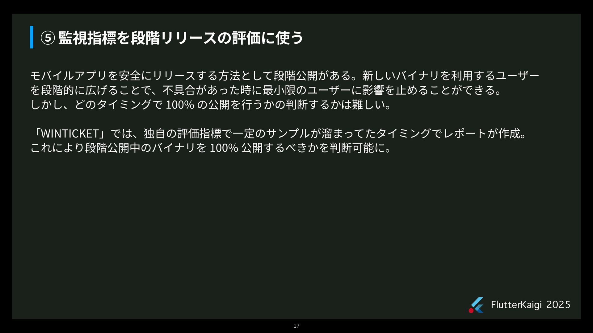 10. FlutterKaigi 2025 1 7 ⑤ 監視指標を段階リリースの評価に使う モバイルアプリを安全にリリースする 方 法として段階公開がある。新しいバイナリを利 用