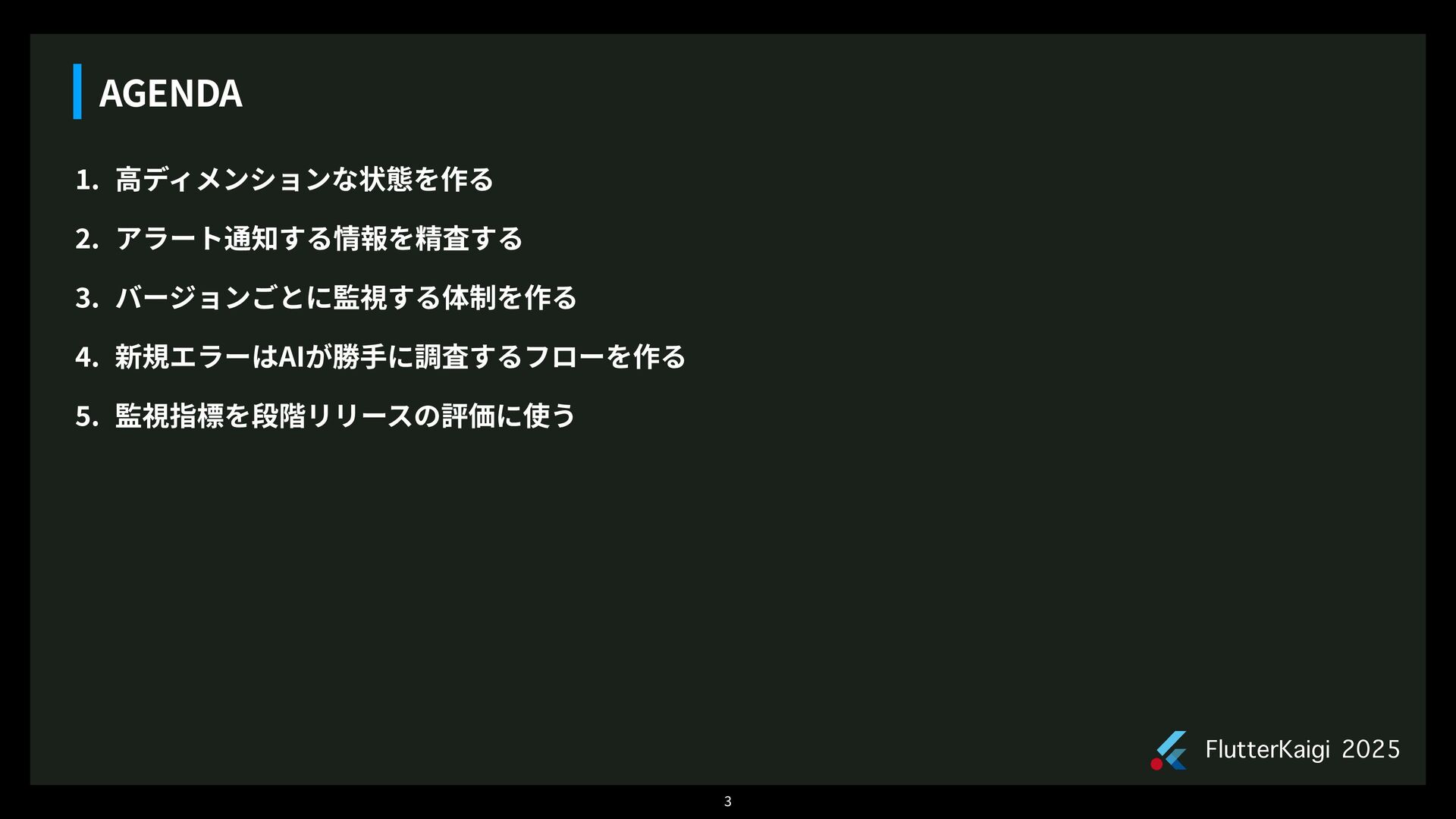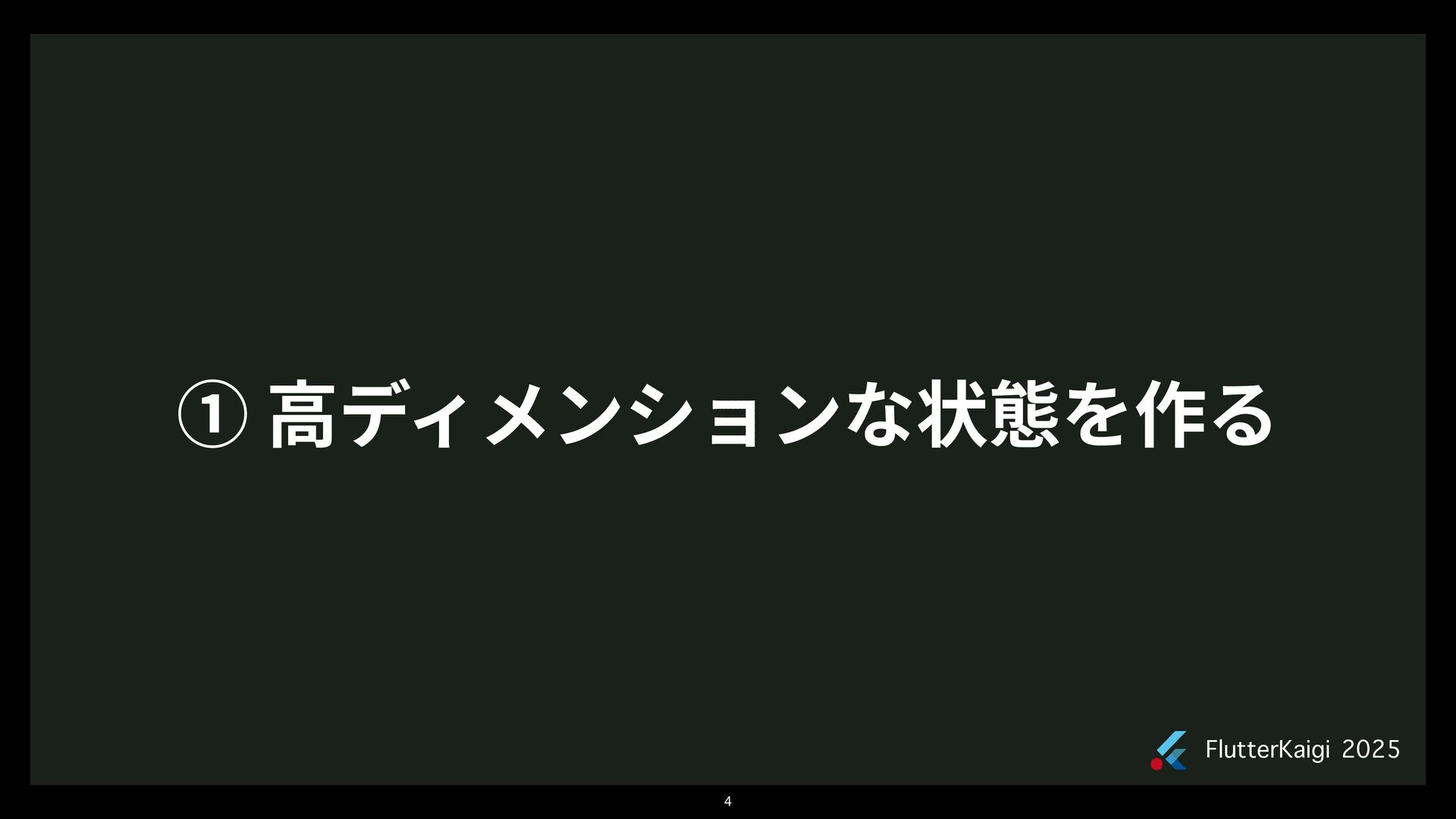 2. FlutterKaigi 2025 3 AGENDA 1 . 高 ディメンションな状態を作る 2 .