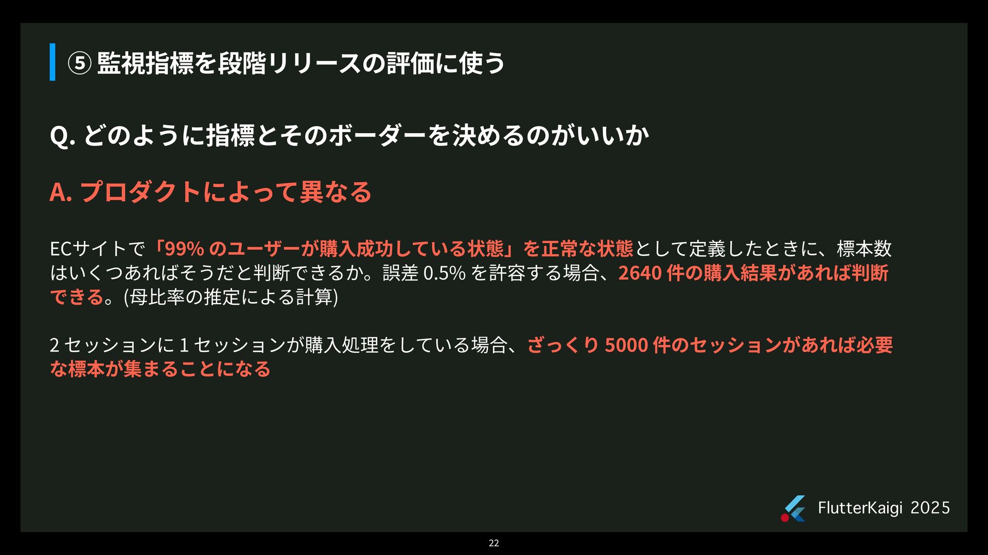 15. FlutterKaigi 2025 2 3 ⑤ 監視指標を段階リリースの評価に使う おまけ( 母比 率の推定解説) 母比