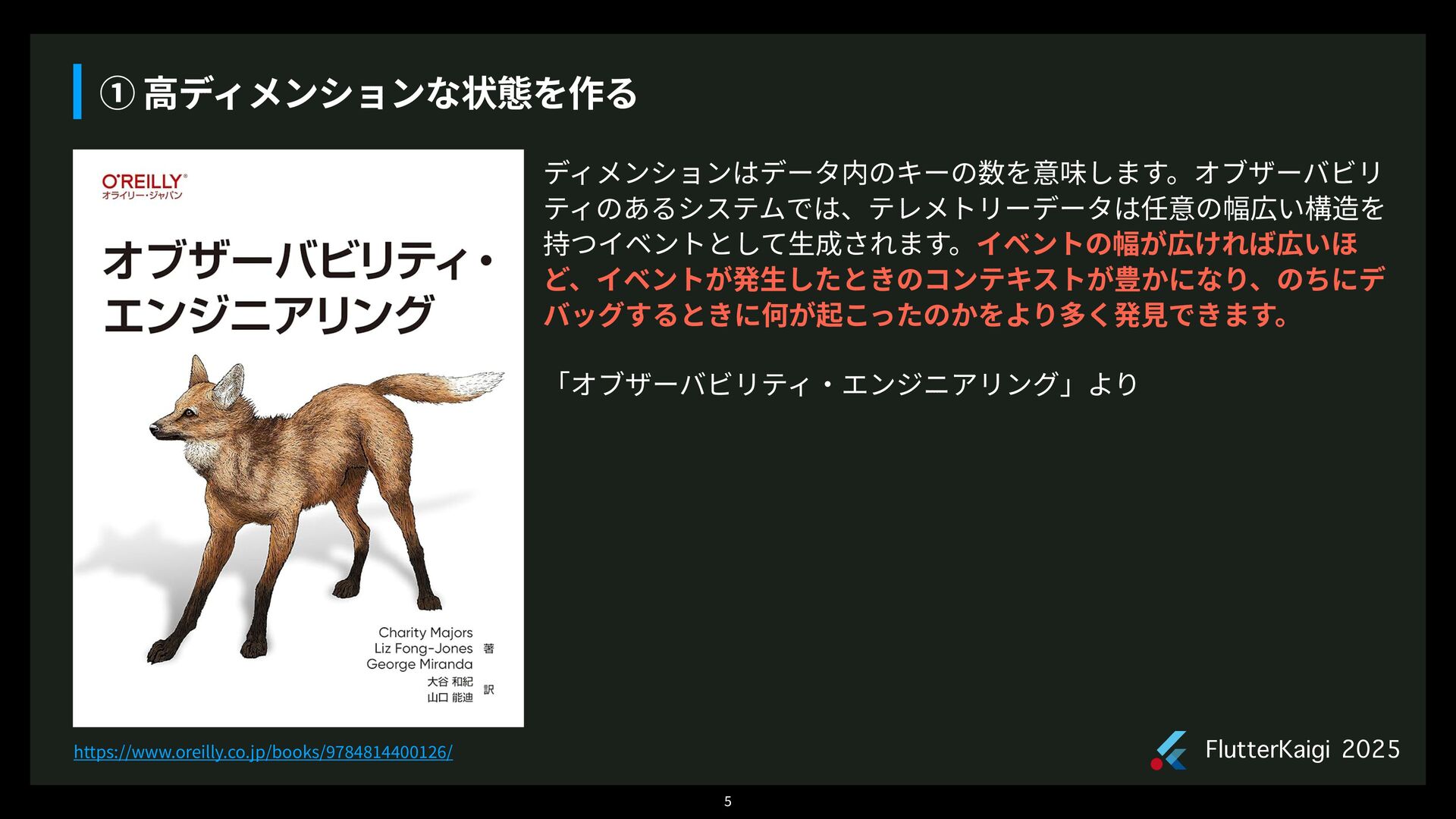 3. FlutterKaigi 2025 5 ① 高 ディメンションな状態を作る ディメンションはデータ内のキーの数を意味します。オブザーバビリ ティのあるシステムでは、テレメトリーデータは任意の幅広い構造を 持つイベントとして 生