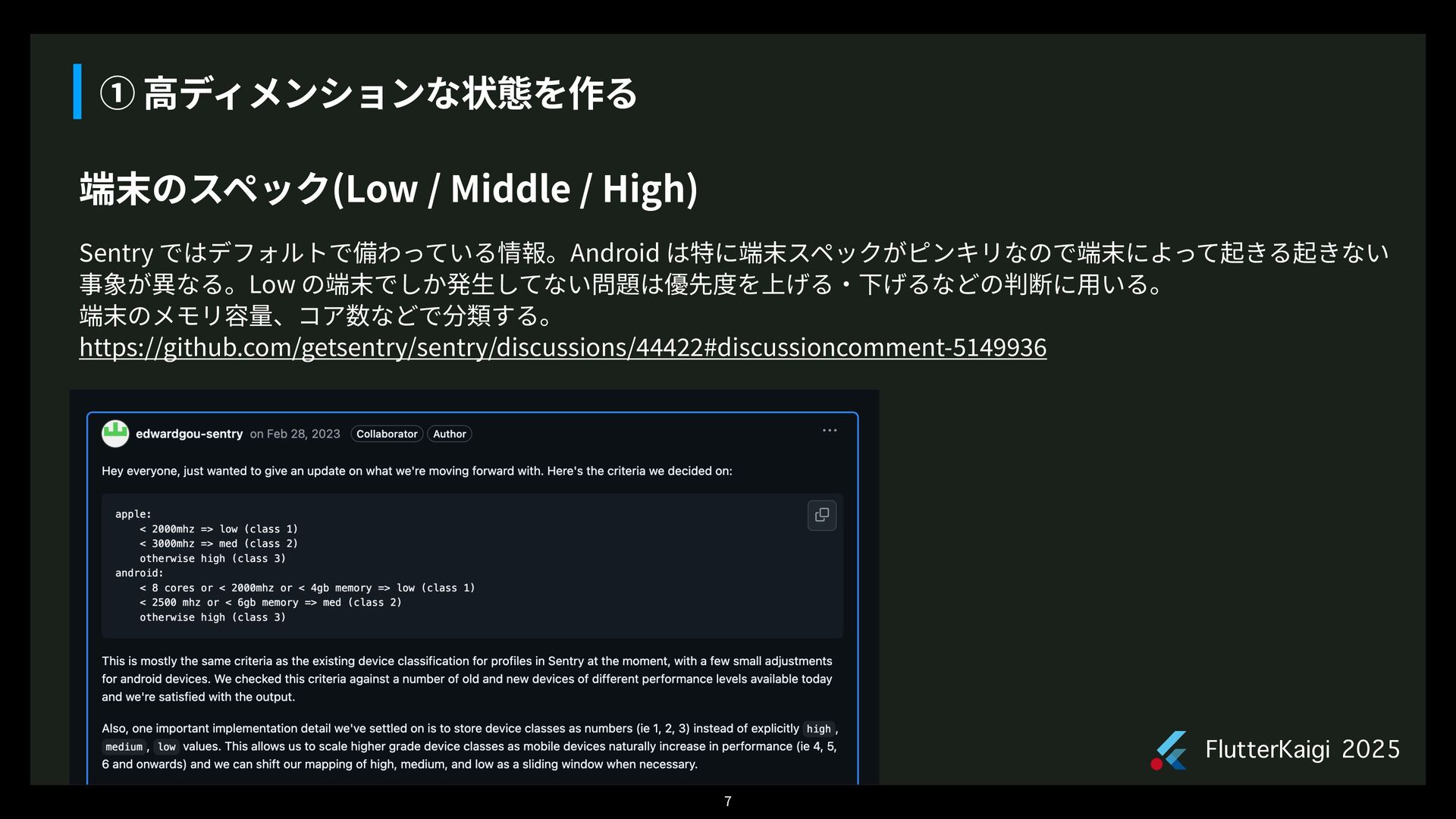 High) Sentry ではデフォルトで備わっている情報。Android は特に端末スペックがピンキリなので端末によって起きる起きない 事象が異なる。Low の端末でしか発 生 してない問題は優先度を上げる ・ 下げるなどの判断に 用 いる。 端末のメモリ容量、コア数などで分類する。 https://github.com/getsentry/sentry/discussions/ 4 4 4 2 2 #discussioncomment- 5 1 4 9 9 3 6 その他は割愛…!