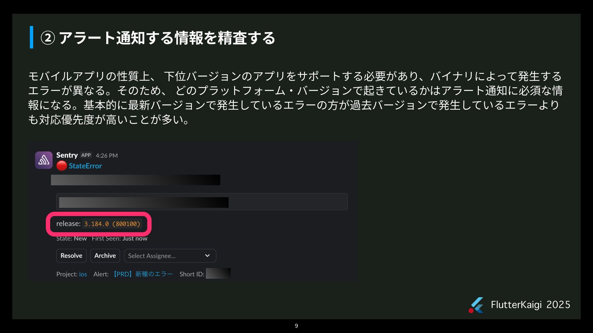 6. FlutterKaigi 2025 9 ② アラート通知する情報を精査する モバイルアプリの性質上、 下位バージョンのアプリをサポートする必要があり、バイナリによって発 生 する エラーが異なる。そのため、