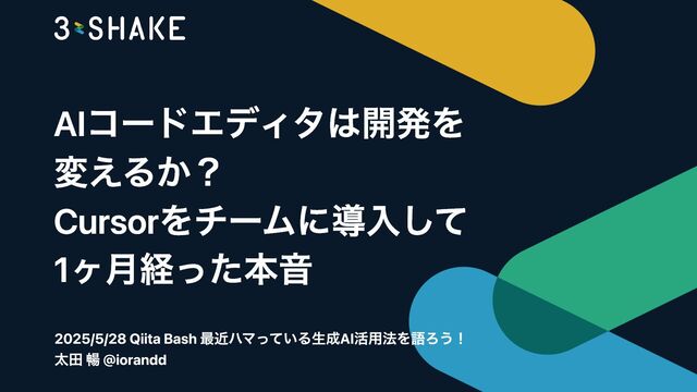 AIコードエディタは開発を 変えるか? Cursorをチームに導入して 1ヶ月経った本音 2025/5/28 Qiita Bash 最近ハマっている生成AI活用法を語ろう! 太田 暢