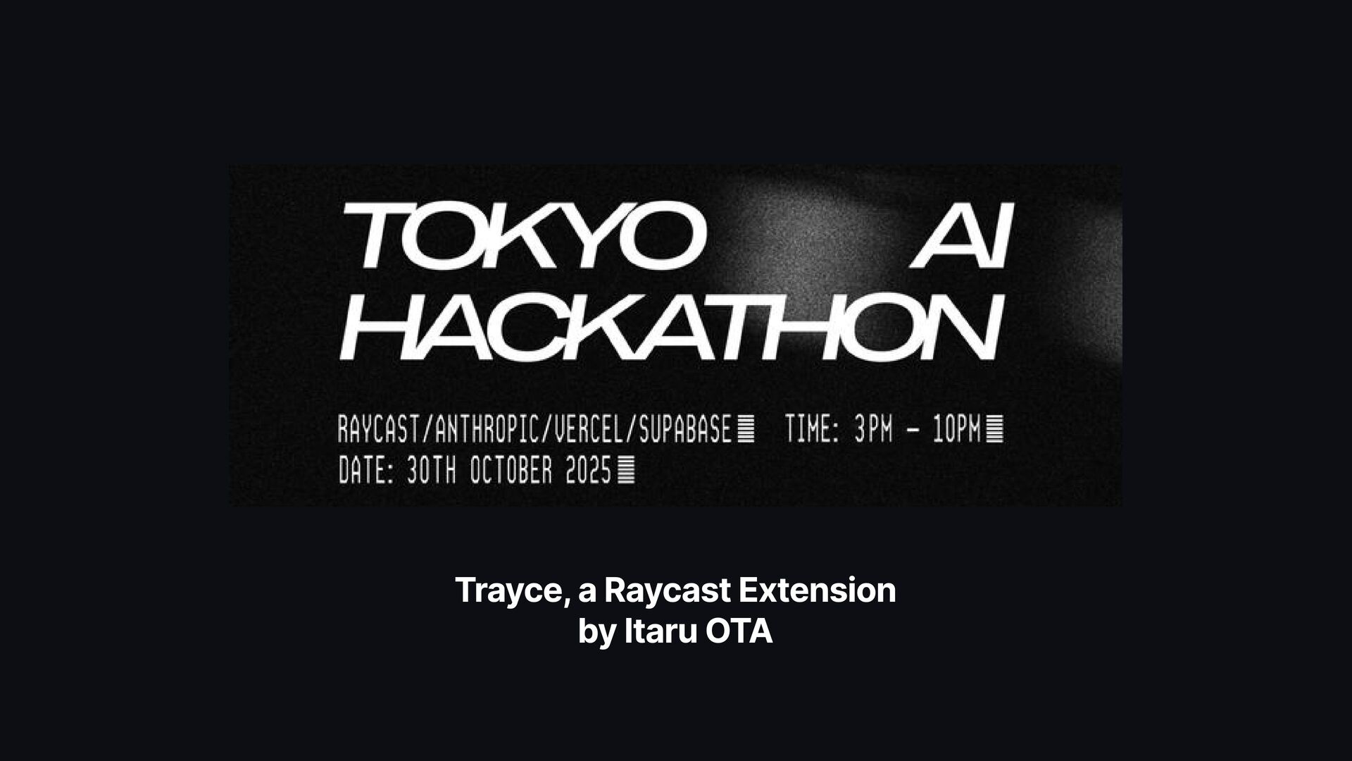 The pitch deck for a Raycast extension called Trayce, created at the Tokyo AI Hackathon. https://raycast.connpass.com/event/369928/