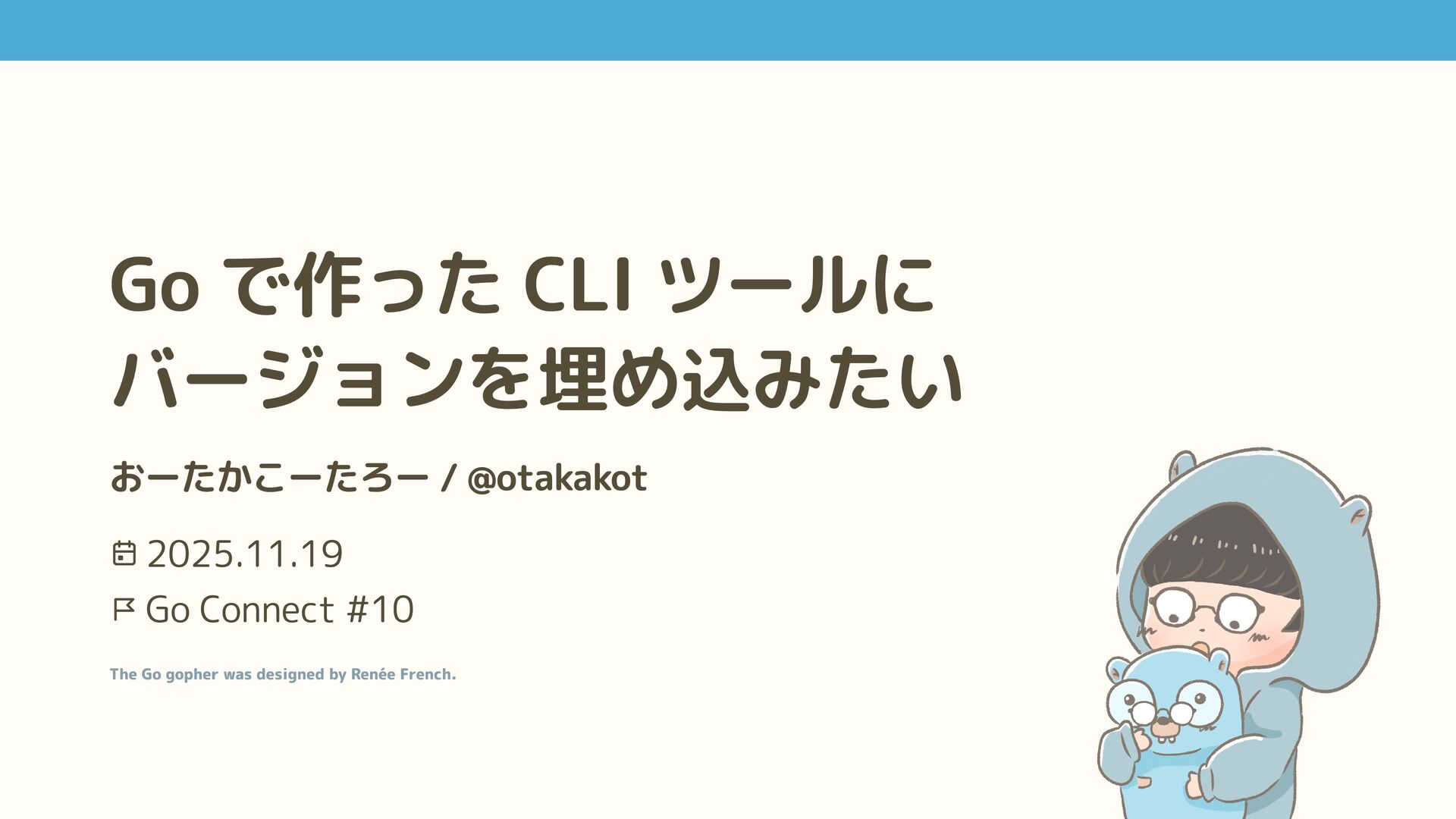 CLI ツールに バージョンを埋め込みたい おーたかこーたろー / @otakakot 2025.11.19 Go Connect #10