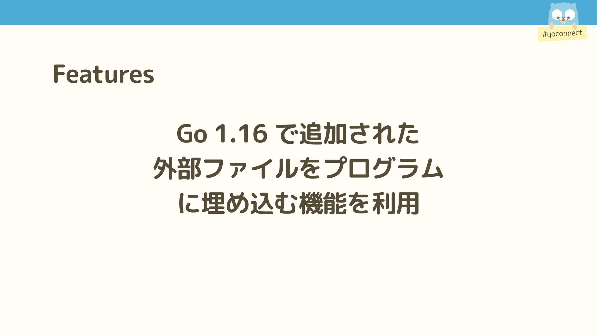 Go 1.16 で追加された 外部ファイルをプログラム に埋め込む機能を利用 #goconnect Features