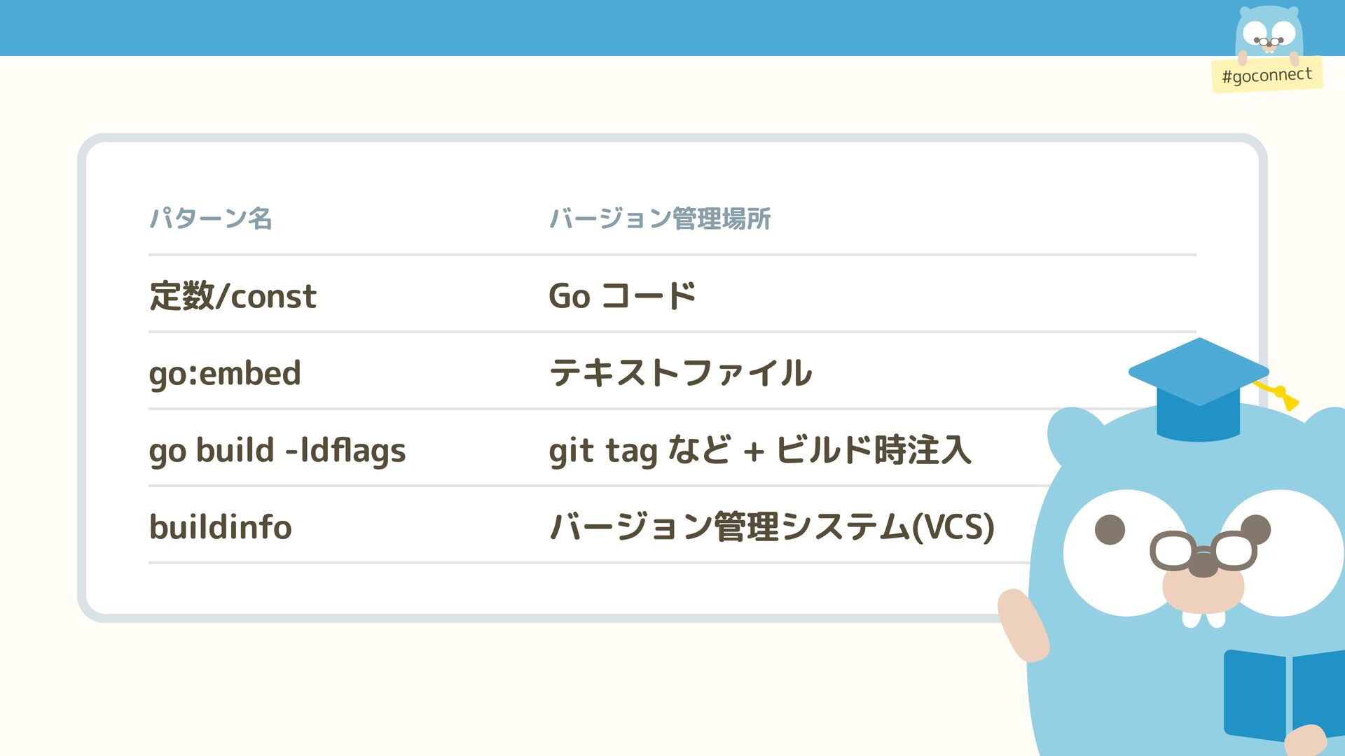 パターン名 バージョン管理場所 定数/const Go コード go:embed テキストファイル go build -ldflags