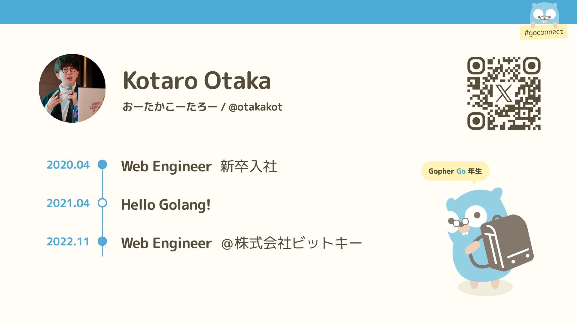 Golang! Web Engineer @株式会社ビットキー 2020.04 2021.04 2022.11 Gopher 年生 Go