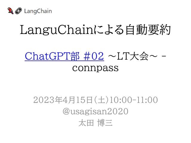 〜 ChatGPT部 #02 〜LT大会〜 - connpass 2023年4月15日(土)10:00-11:00
