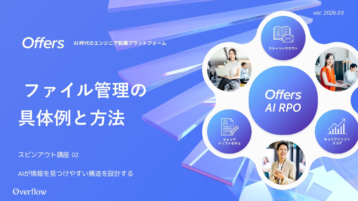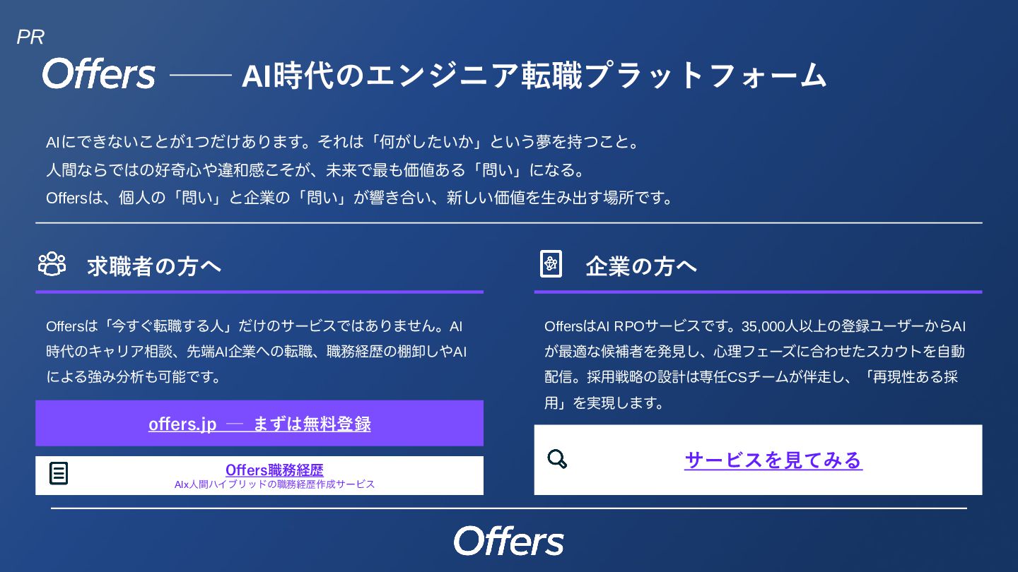 15.     ── AI時代のエンジニア転職プラットフォーム AIにできないことが1つだけあります。それは「何がしたいか」という夢を持つこと。 人間ならではの好奇心や違和感こそが、未来で最も価値ある「問い」になる。 Offersは、個人の「問い」と企業の「問い」が響き合い、新しい価値を生み出す場所です。 求職者の方へ Offersは「今すぐ転職する人」だけのサービスではありません。AI 時代のキャリア相談、先端AI企業への転職、職務経歴の棚卸しやAI による強み分析も可能です。 offers.jp