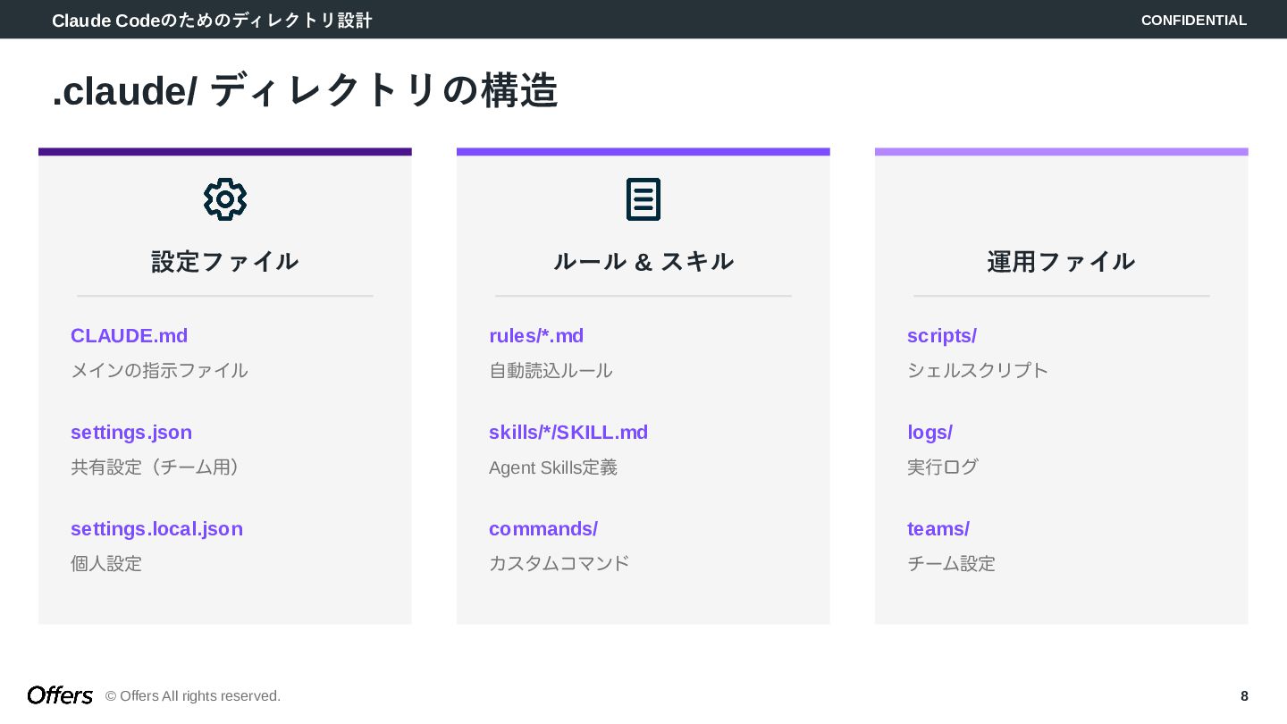 8. Claude Codeのためのディレクトリ設計 CONFIDENTIAL © Offers All rights reserved. 8 .claude/