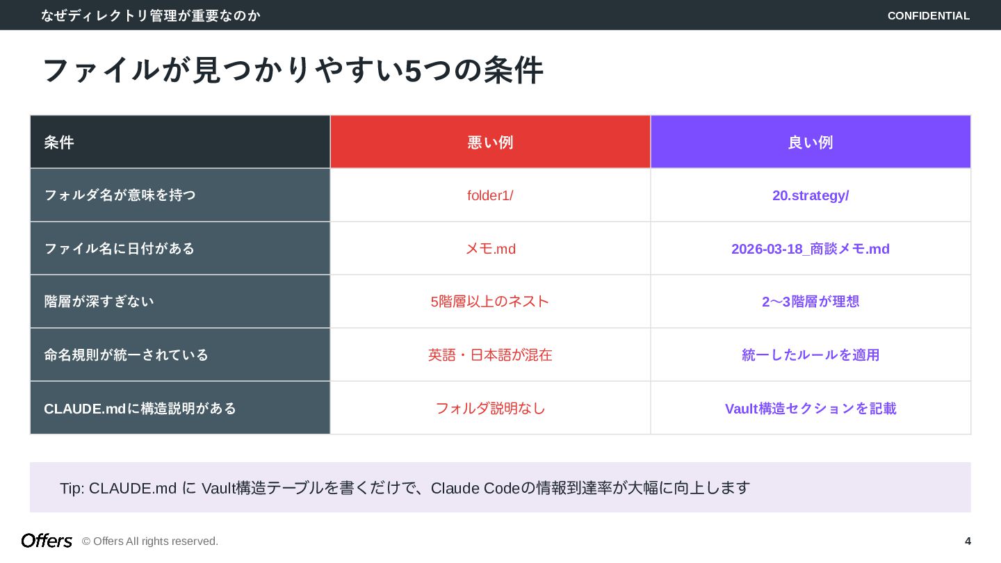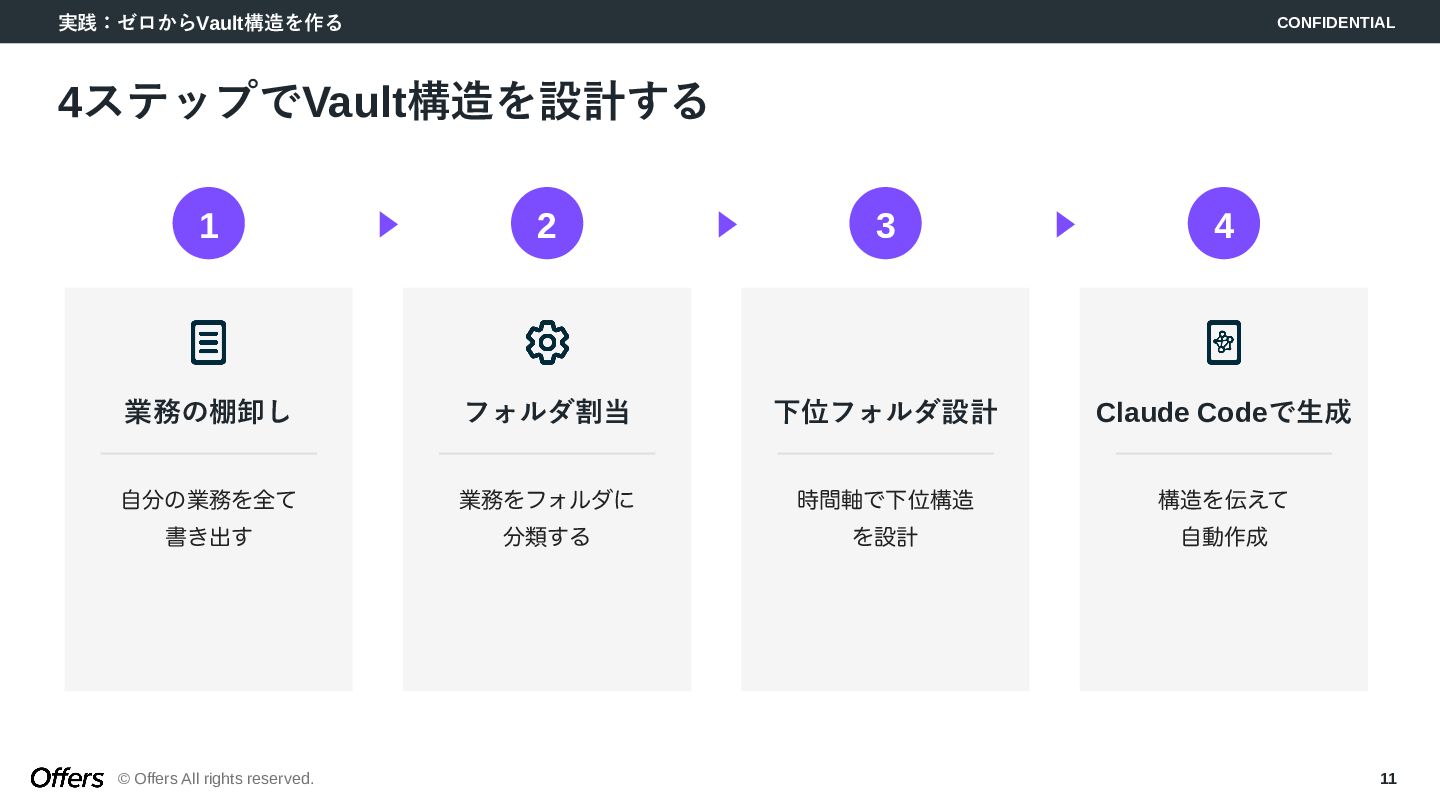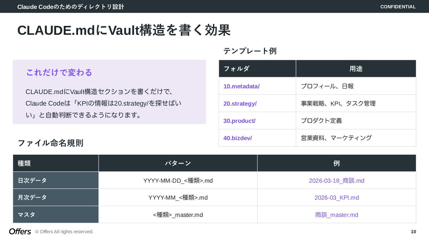 10. Claude Codeのためのディレクトリ設計 CONFIDENTIAL © Offers All rights reserved. 10 CLAUDE.mdにVault構造を書く効果
