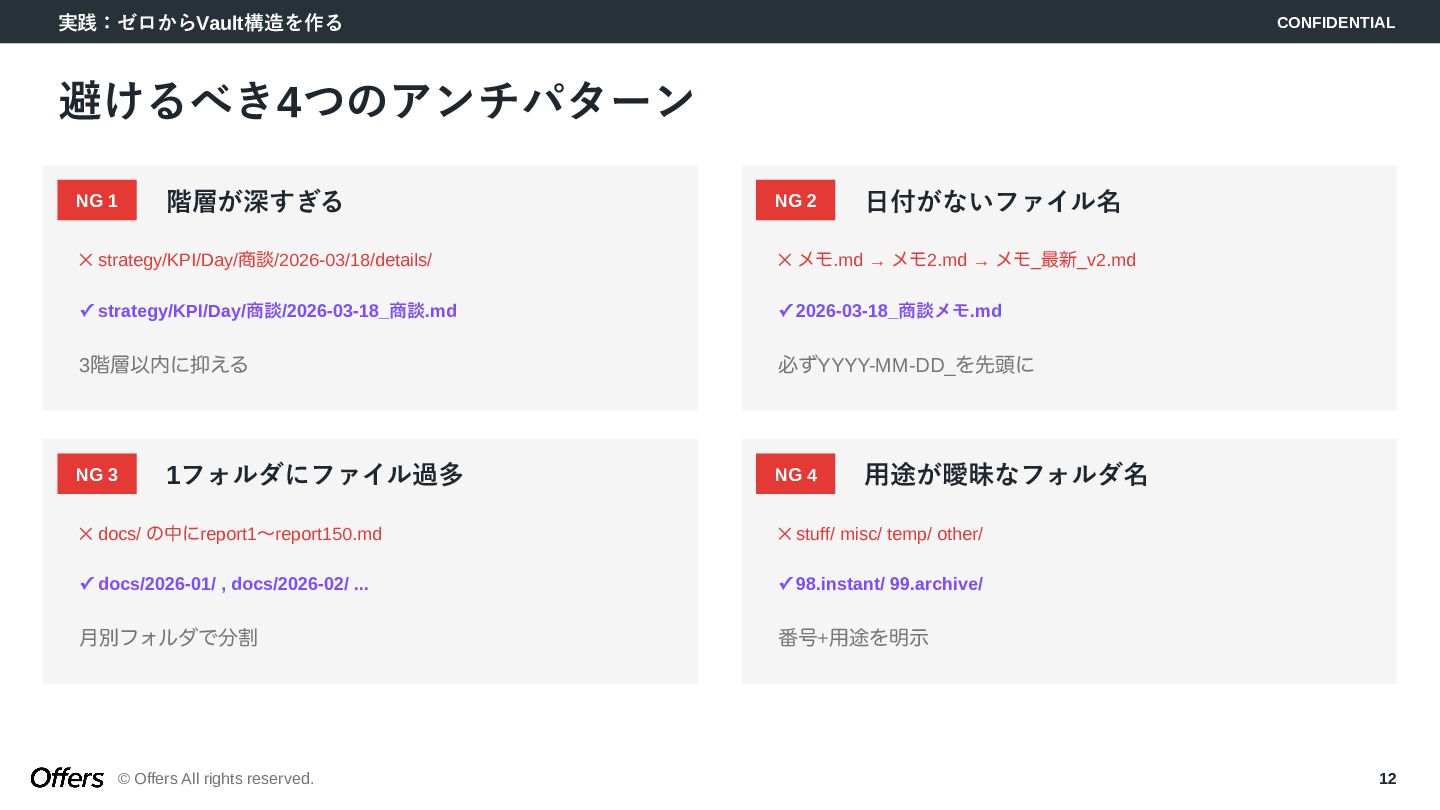 12. 実践:ゼロからVault構造を作る CONFIDENTIAL © Offers All rights reserved. 12 避けるべき4つのアンチパターン NG
