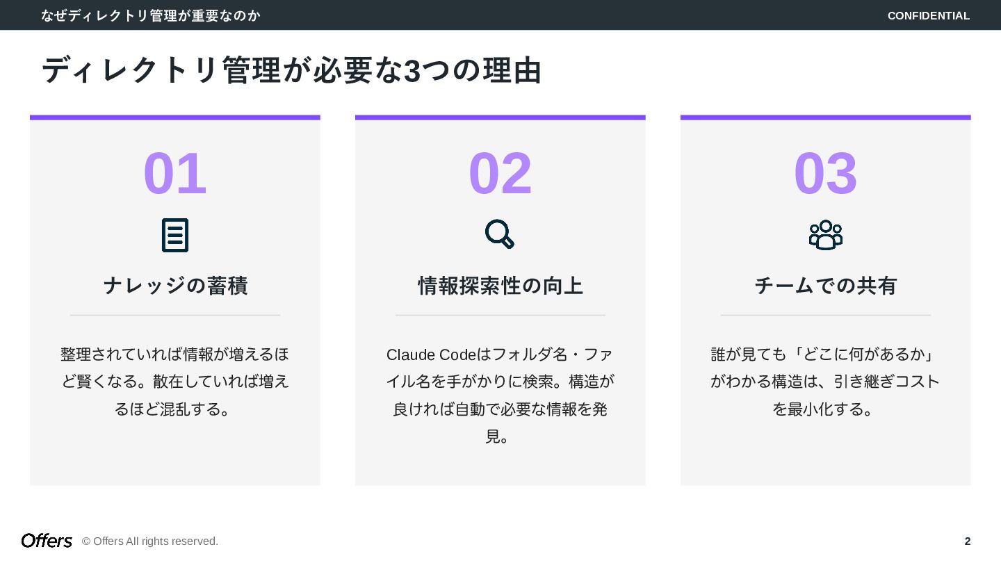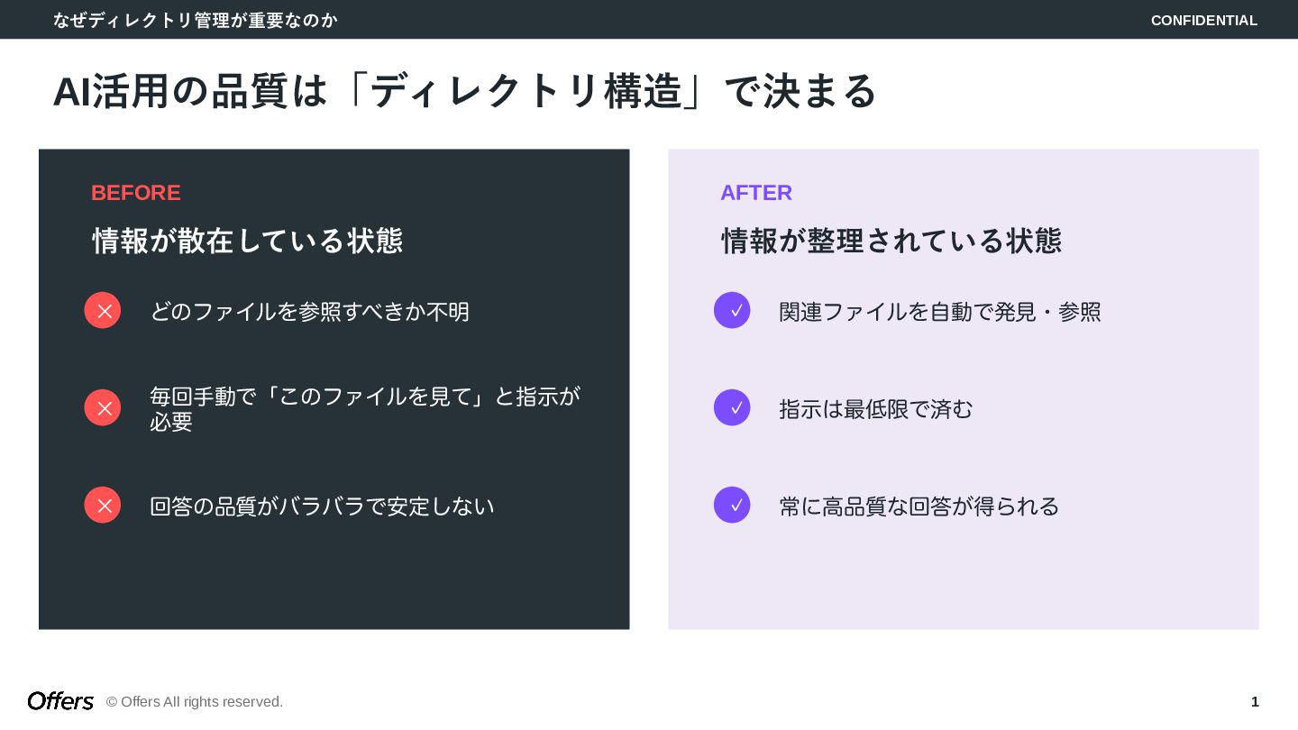 1. なぜディレクトリ管理が重要なのか CONFIDENTIAL © Offers All rights reserved. 1 AI活用の品質は「ディレクトリ構造」で決まる BEFORE